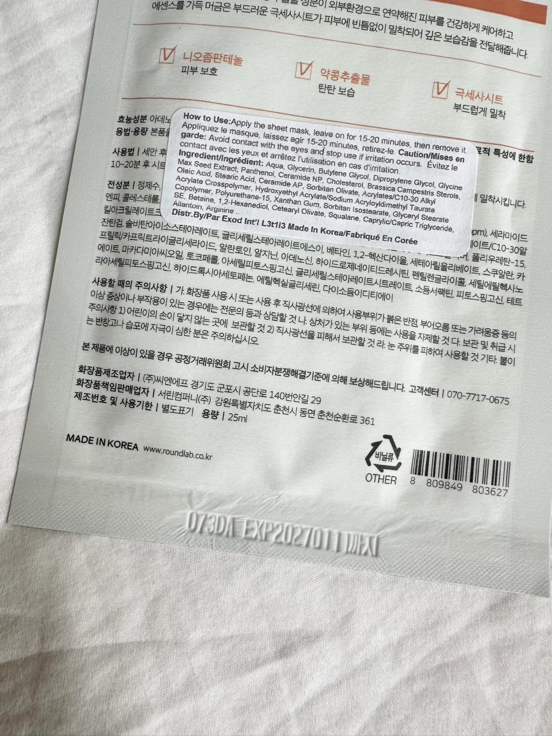 - Round Lab Soybean Panthenol Sheet Mask, 25 ml, EXP 11.01.2027