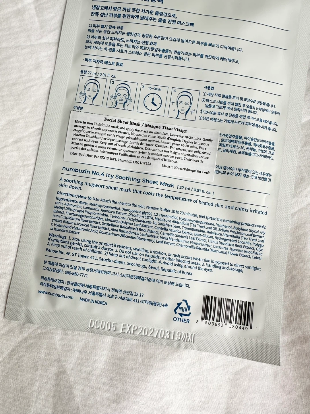 - Numbuzin No.4 Icy Soothing Sheet Mask, 27 ml, EXP 19.03.2027