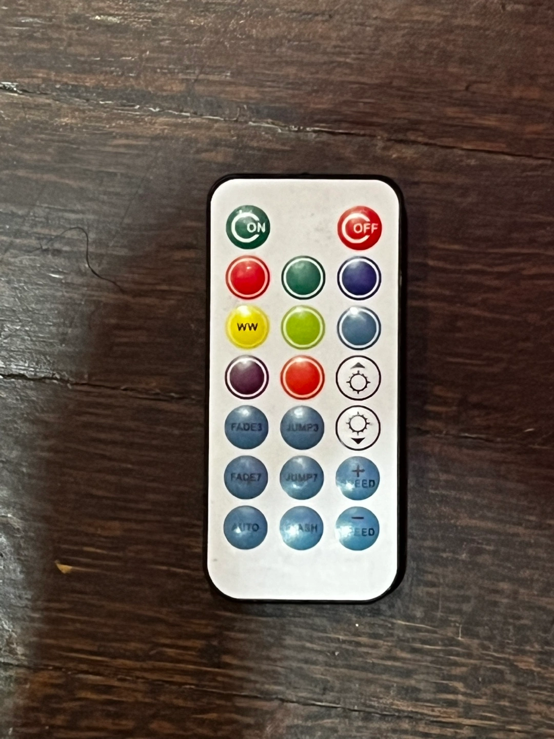 Here's a remote controller for LED strip lights. It has various color and function buttons like on/off, color selection, fade, jump, auto, flash, and speed adjustment