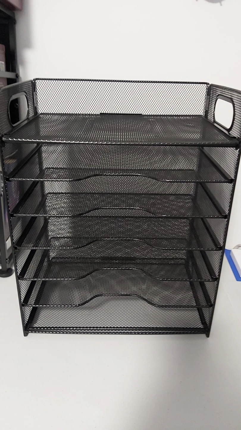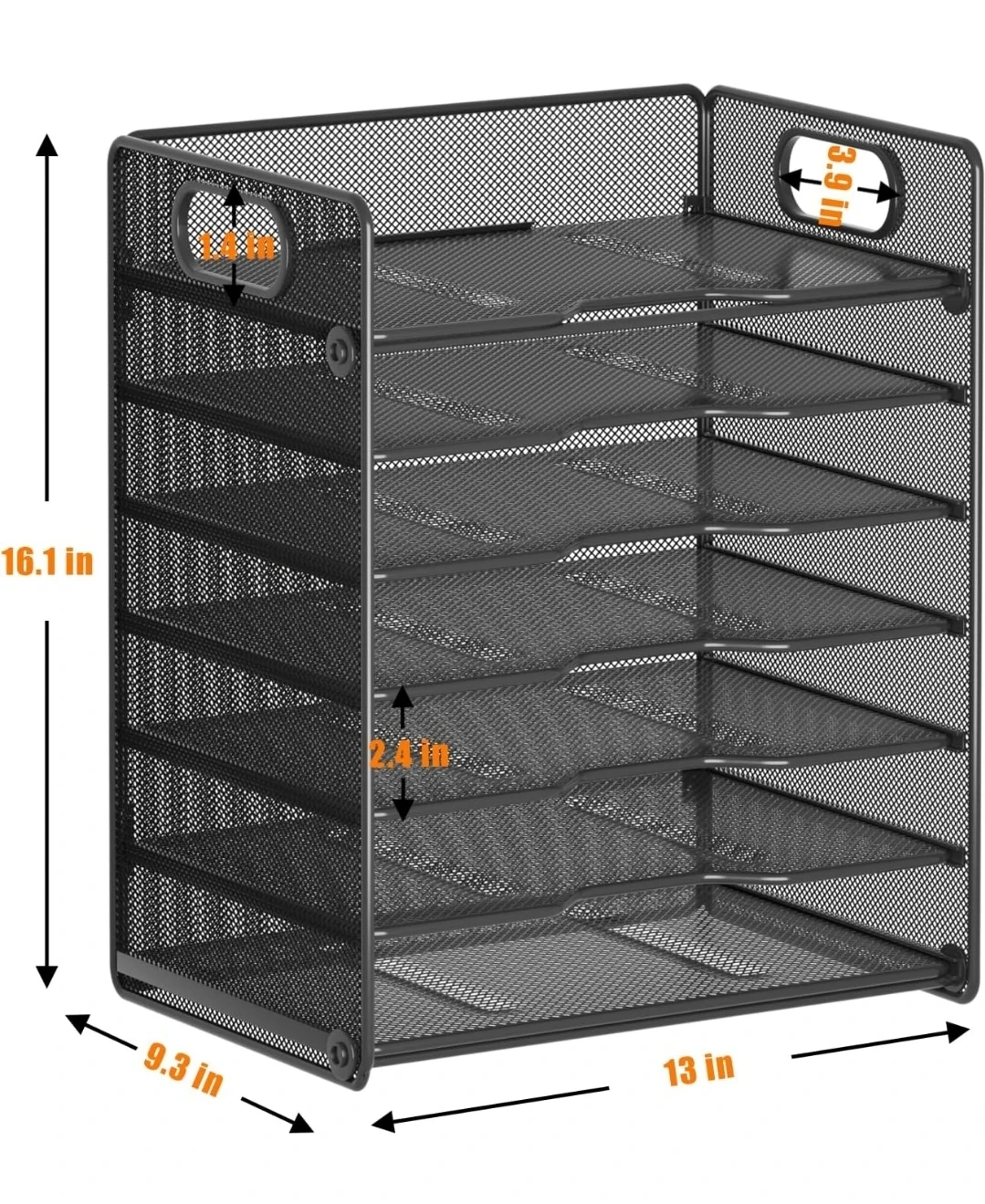 This black mesh desk organizer features nine sliding trays for ample storage. Each tray is 9.3 inches deep and 2.4 inches high, with an overall unit height of 16.1 inches. It's made of durable mesh metal and includes built-in side handles for easy transport. Great for organizing mail, documents, or office supplies!