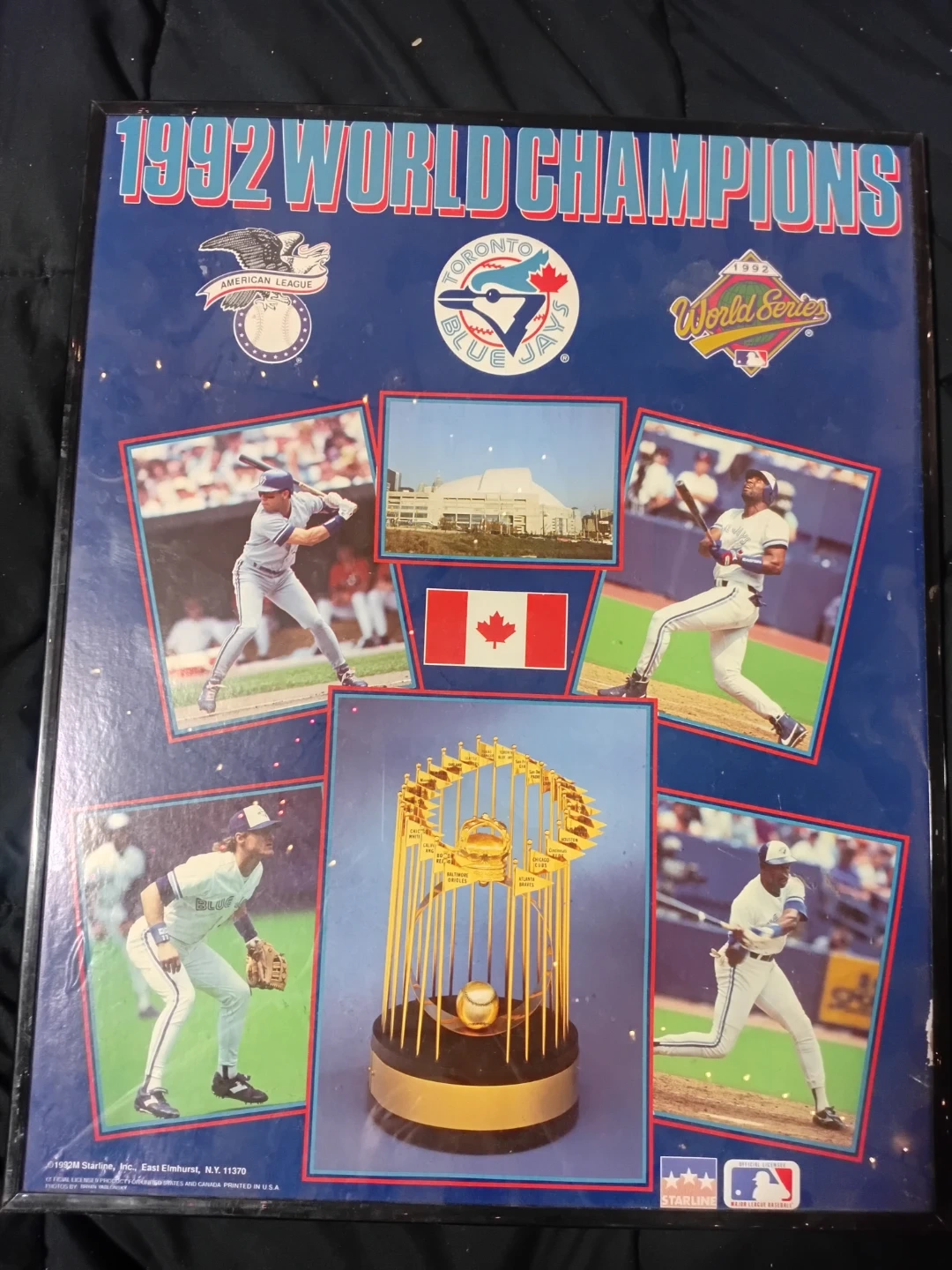 Selling a framed poster commemorating the Toronto Blue Jays' 1992 World Series victory! It features images of key players and the World Series trophy. A great piece of memorabilia for any Blue Jays fan!