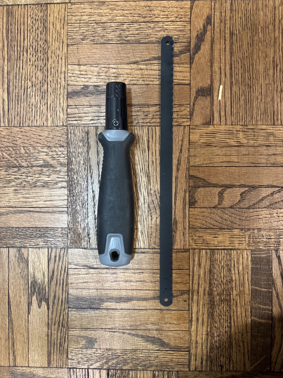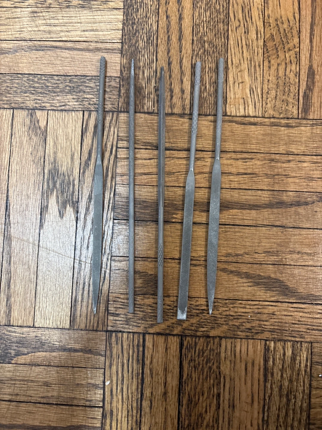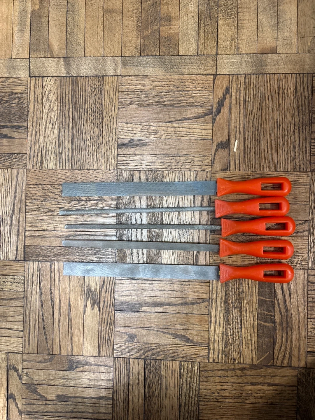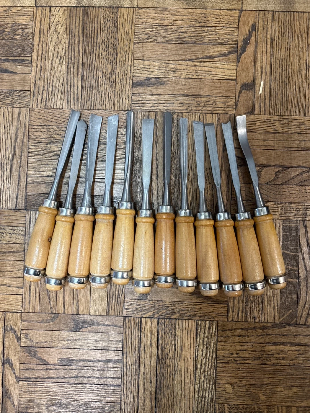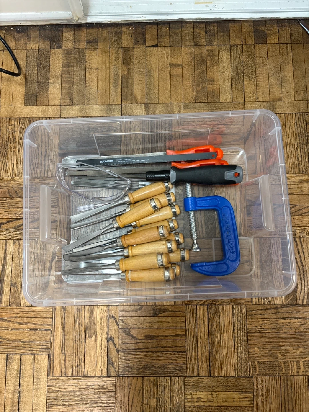 This set includes 11 wood chisels with wooden handles. It also comes with a hacksaw with one blade, a set of 5 files with orange handles, and a Mastercraft C-clamp. Bin included