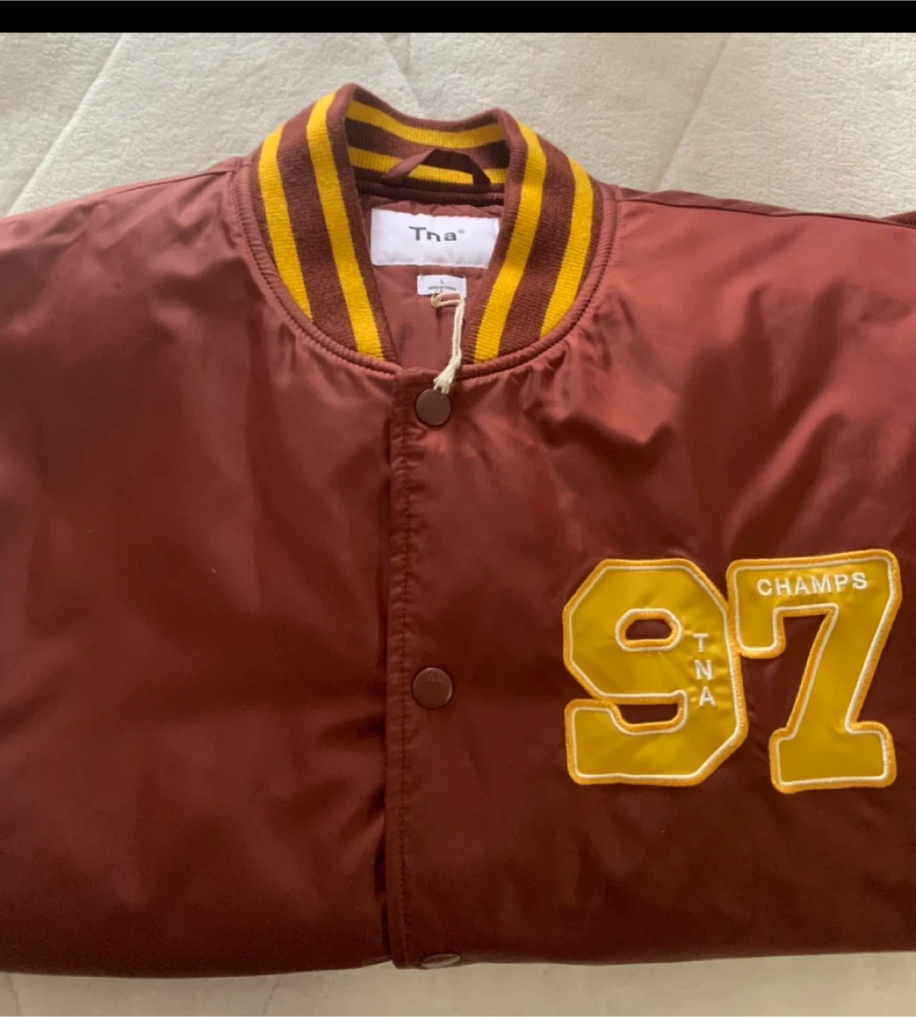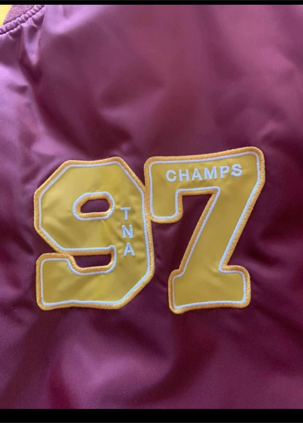 Tna varsity bomber jacket in burgundy and yellow. It's a size large with a snap button closure. Features a '97 Champs' graphic on the front.