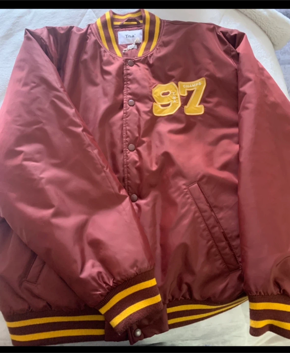 Tna varsity bomber jacket in burgundy and yellow. It's a size large with a snap button closure. Features a '97 Champs' graphic on the front.