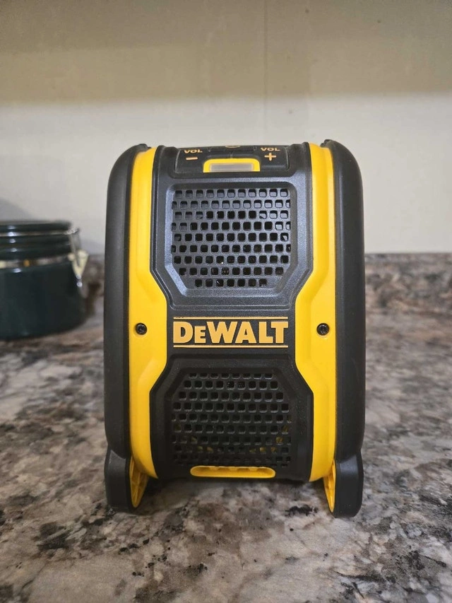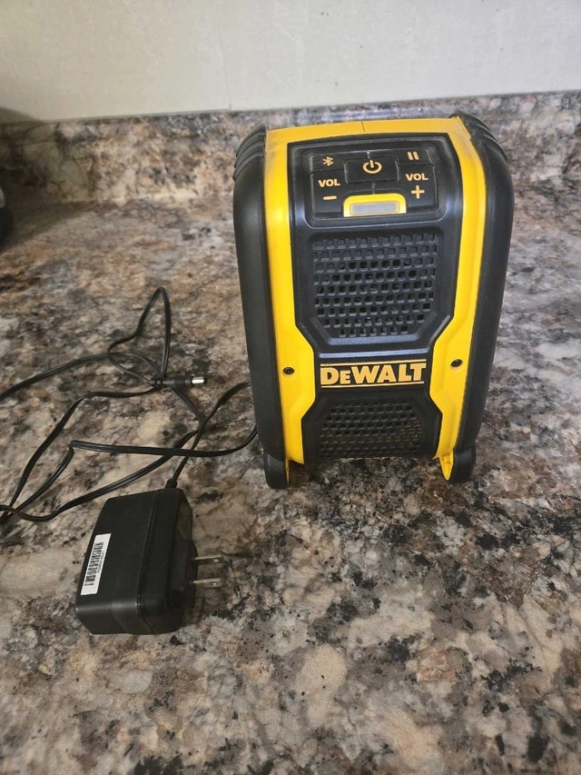 Listen to your favourite tunes on the job site with this Dewalt Bluetooth speaker. It features Bluetooth connectivity, aux input, and USB power port to charge your devices, and is compatible with 12V and 20V Dewalt batteries. This item is used but in good condition, ready to provide the soundtrack to your next project.