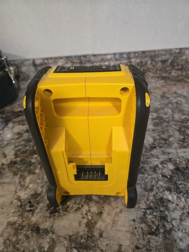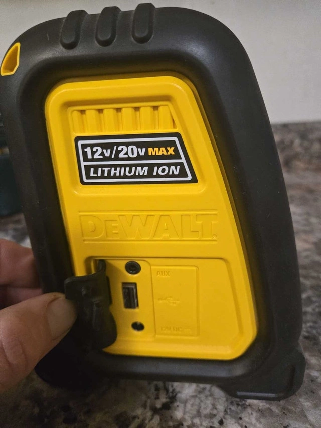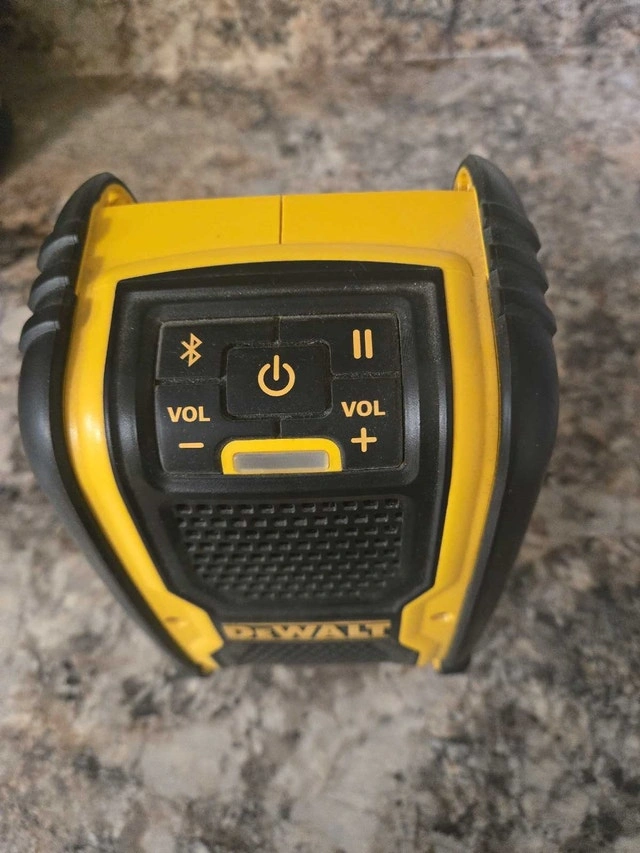Listen to your favourite tunes on the job site with this Dewalt Bluetooth speaker. It features Bluetooth connectivity, aux input, and USB power port to charge your devices, and is compatible with 12V and 20V Dewalt batteries. This item is used but in good condition, ready to provide the soundtrack to your next project.