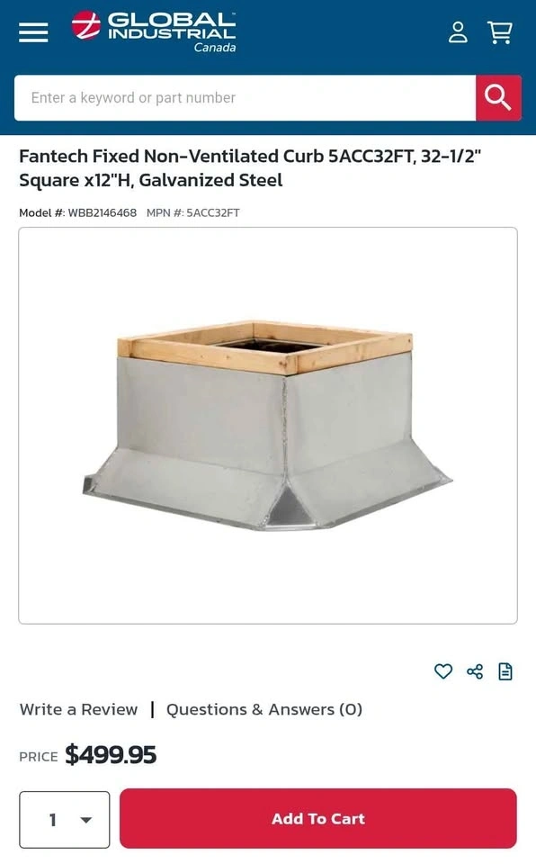 Brand New Fantech Fixed Non-Ventilated Curb 5ACC32FT. Galvanized Steel Fixed Non-Vented Curb for 32-in Commercial Roof Vents. Fantech 5ACC32FS. Part Number 5ACC32FS, 47226. Material Steel. Product Dimensions 40.50-in X 29.50-in X 8-in. Weight 45.00-lb.