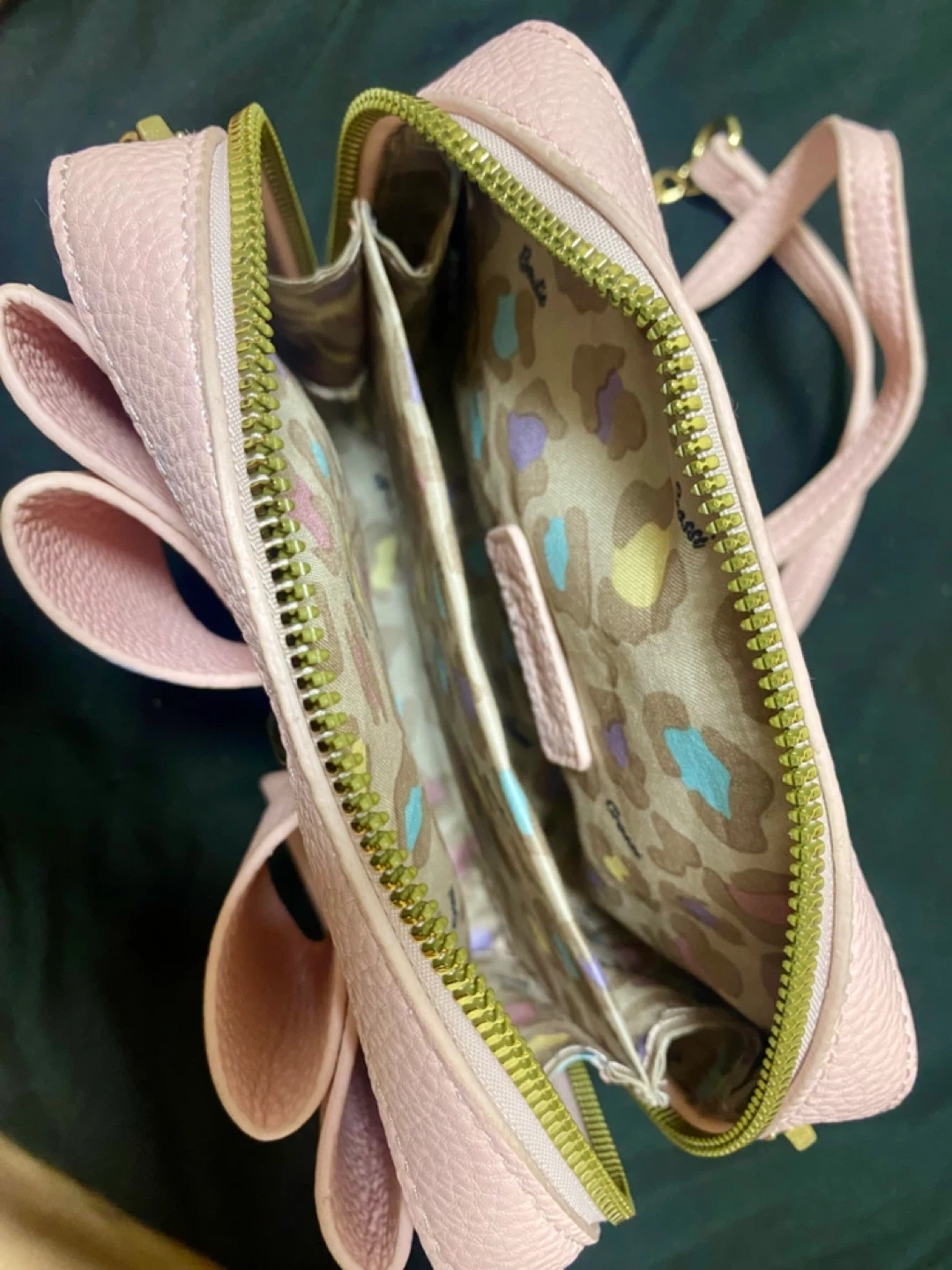 Selling a cute Crossi crossbody bag! It's a lovely light pink colour with a sweet bow detail on the front. The inside has a fun patterned lining. Perfect for adding a touch of charm to any outfit!