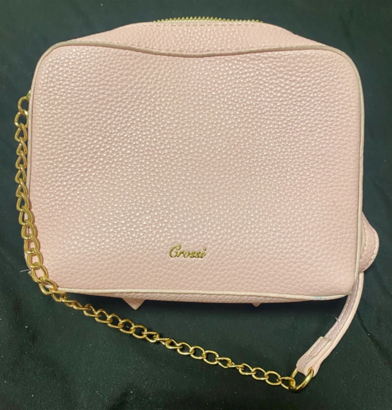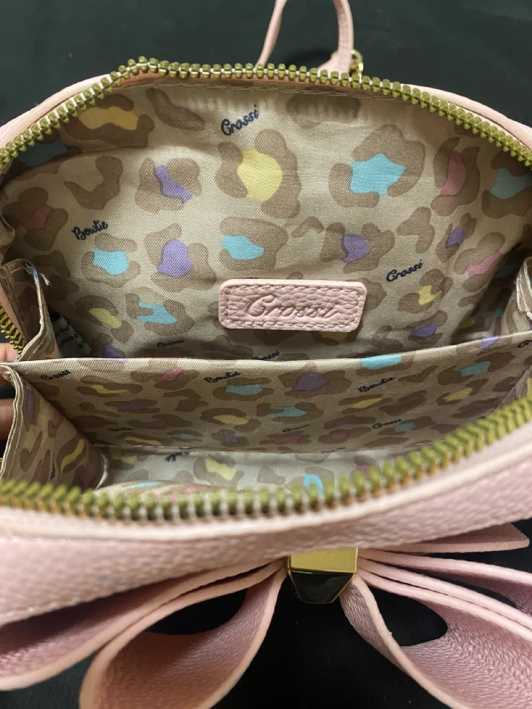 Selling a cute Crossi crossbody bag! It's a lovely light pink colour with a sweet bow detail on the front. The inside has a fun patterned lining. Perfect for adding a touch of charm to any outfit!