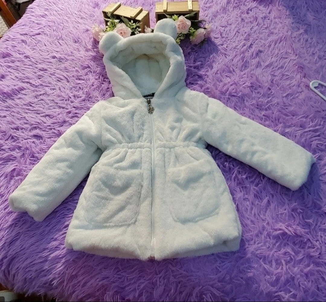 Cozy white faux fur jacket with a soft fleece lining printed with newspaper graphics. It features a drawstring waist and two front pockets. Comes with a cute flower zipper pull!Size 100 toddler fits 2-3years old depending on your kids reference please see measurement