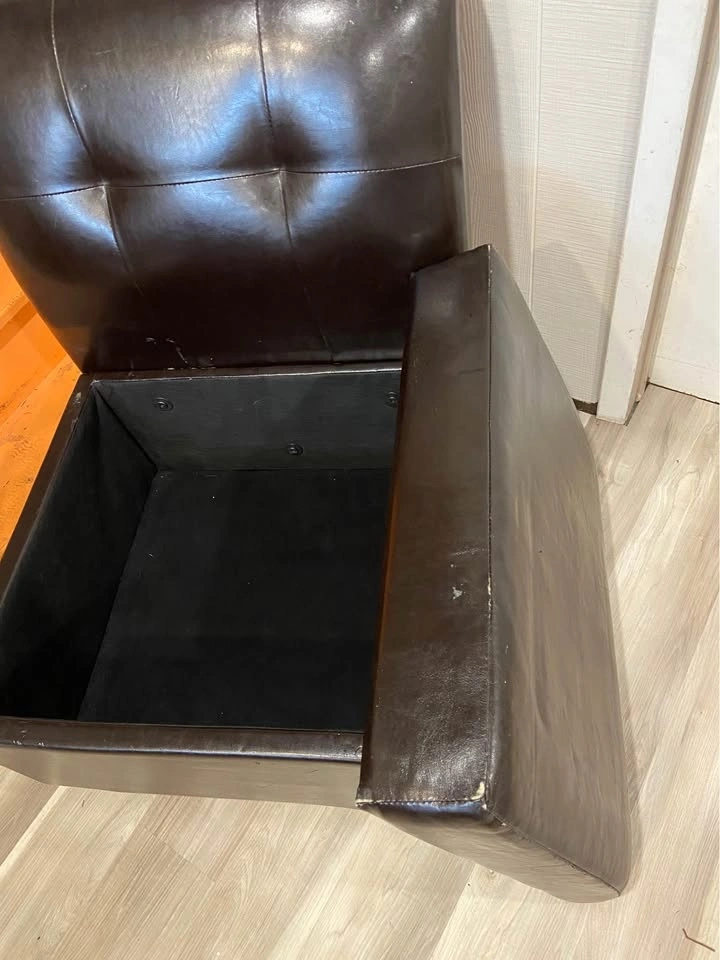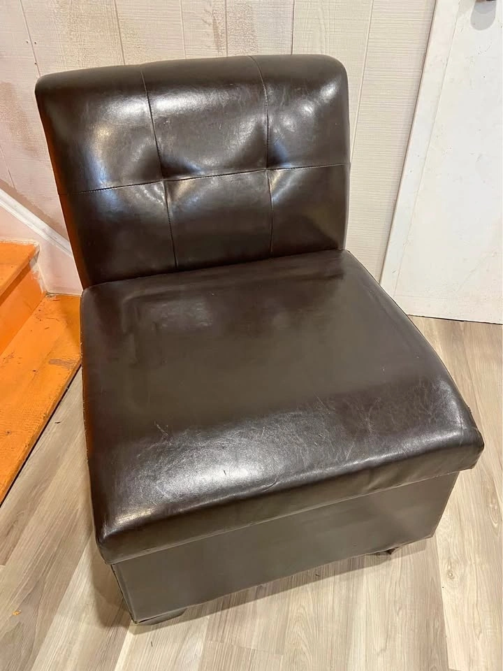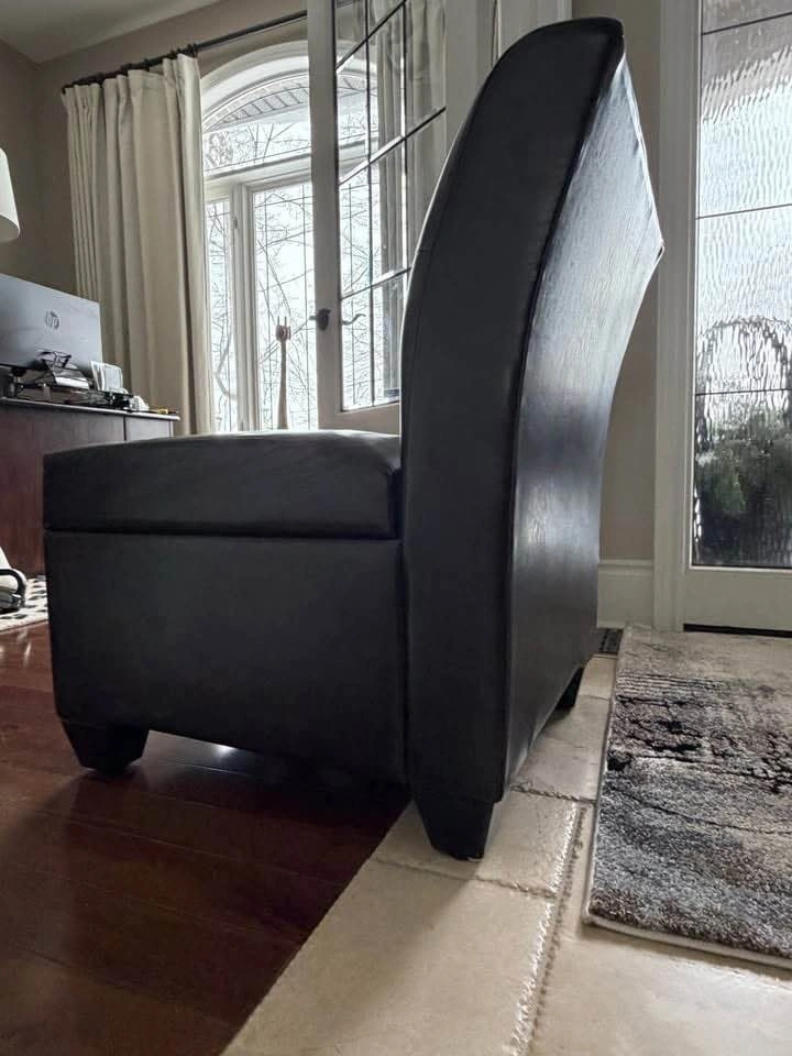 Selling a dark brown (espresso) faux leather slipper chair which is fantastic for storage. Low profile so excellent for those smaller spaces where seating/storage is needed. Measures 24” wide, 18.5” tall to the seat, 22” deep on the seat and 27” deep on the chair. 32” tall to top of back cushion. Solid wood dark brown stained wood feet. Pick up Northside of St. Thomas