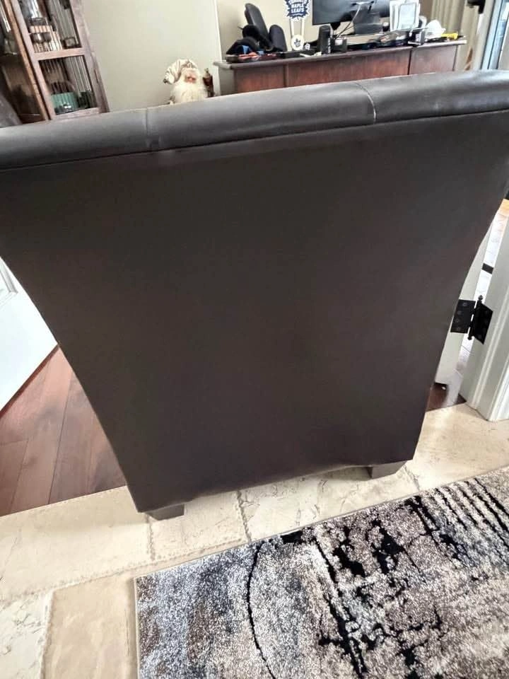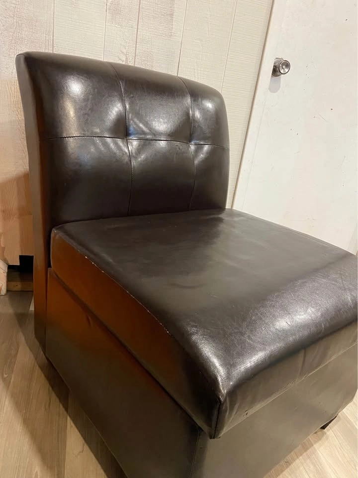 Selling a dark brown (espresso) faux leather slipper chair which is fantastic for storage. Low profile so excellent for those smaller spaces where seating/storage is needed. Measures 24” wide, 18.5” tall to the seat, 22” deep on the seat and 27” deep on the chair. 32” tall to top of back cushion. Solid wood dark brown stained wood feet. Pick up Northside of St. Thomas