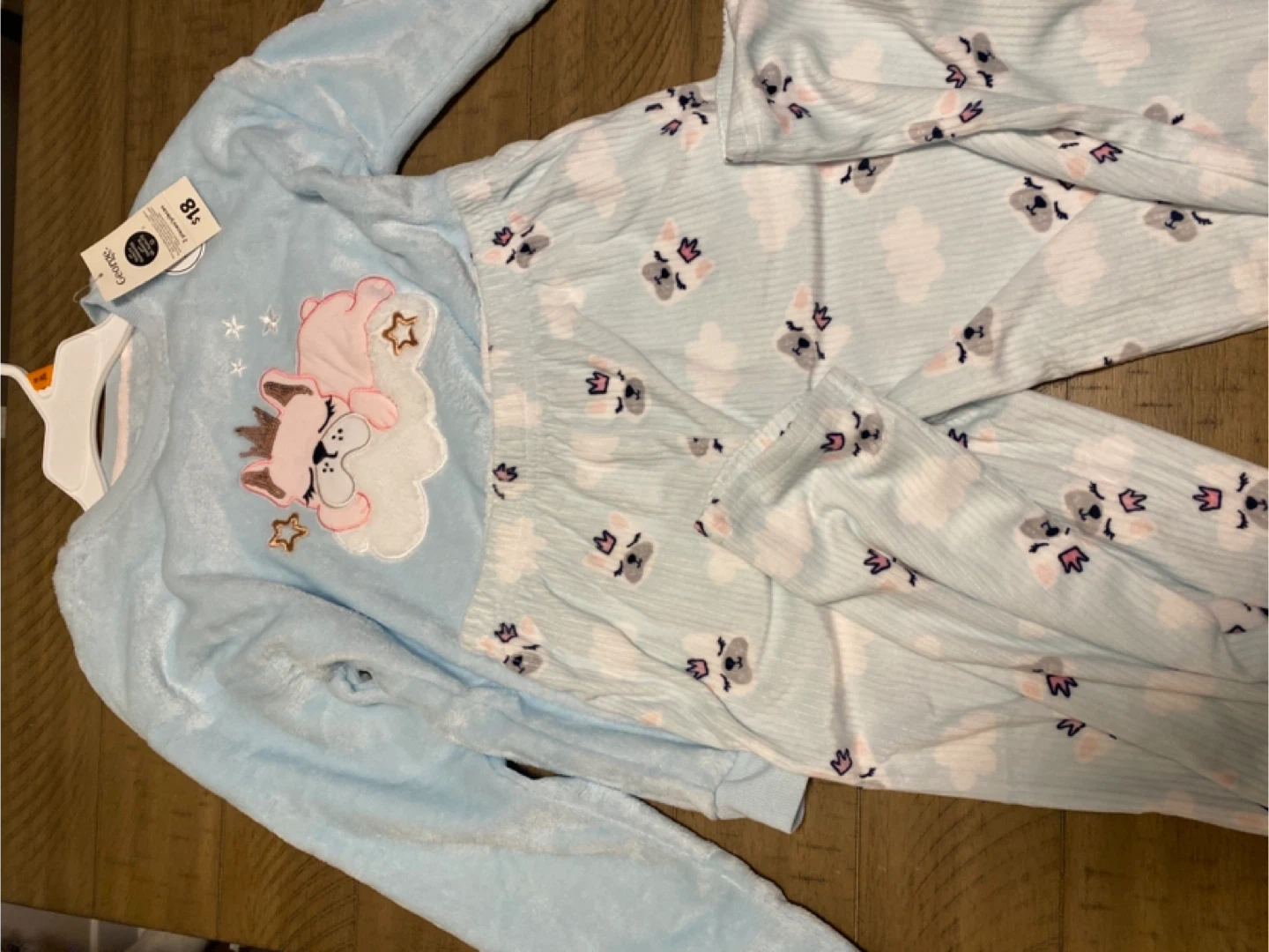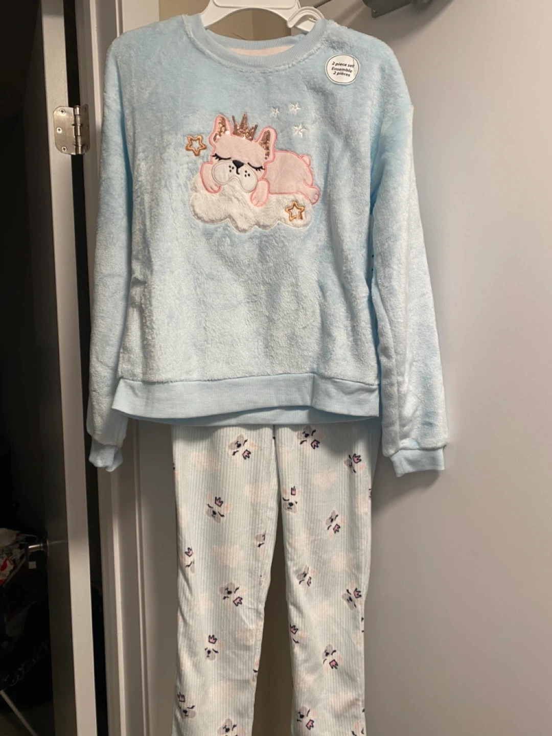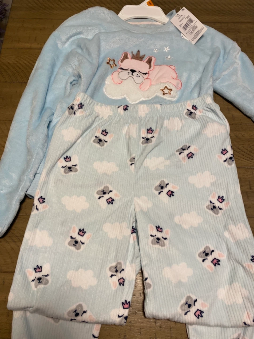 This cozy pajama set features a soft blue fleece pullover top with a cute French bulldog sleeping on a cloud graphic. The matching pants have a playful cloud and Frenchie print. It's a 2-piece set perfect for keeping warm at night!