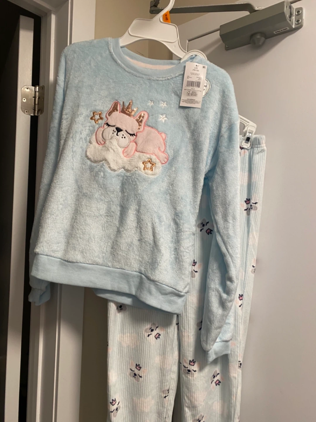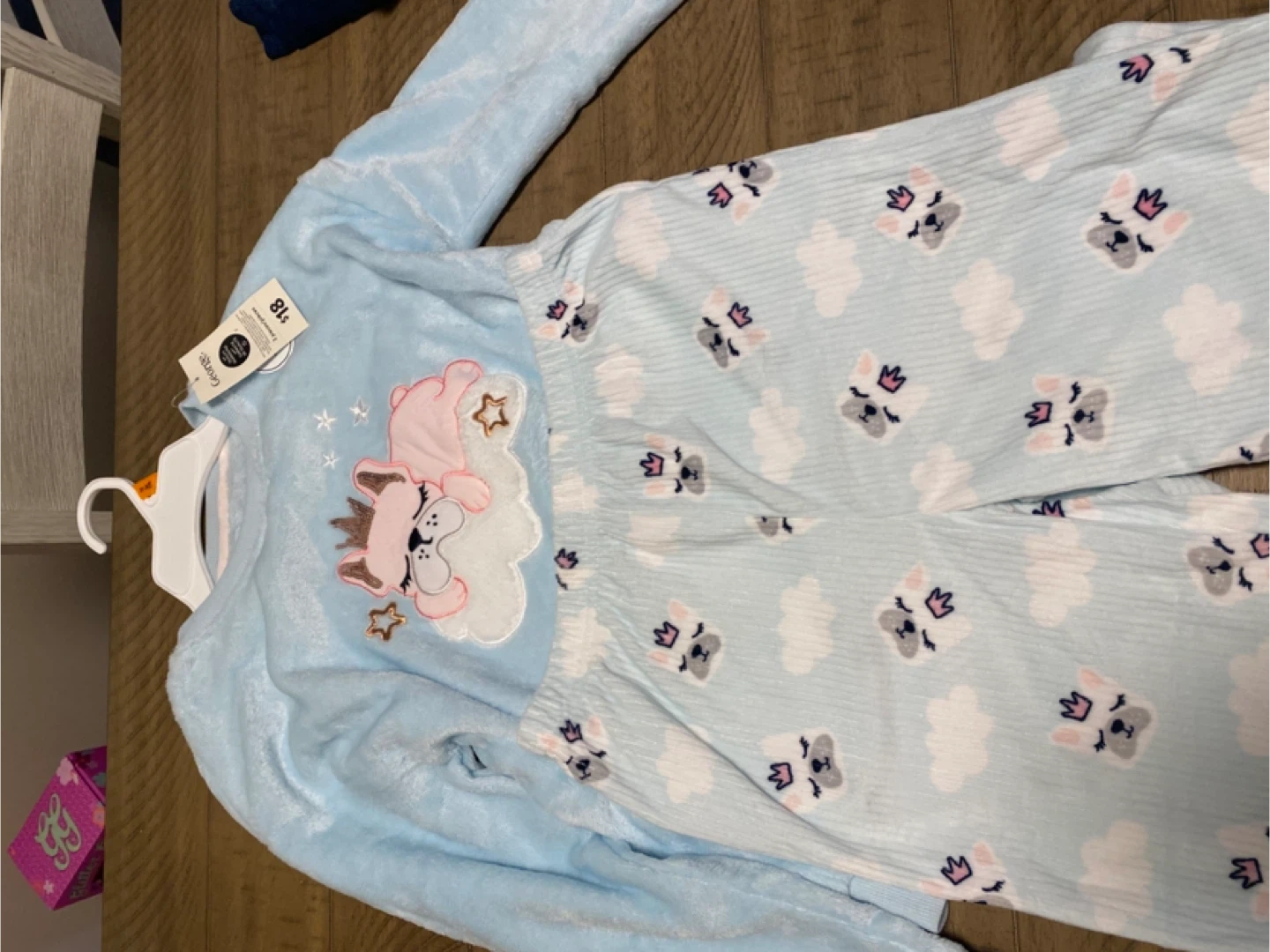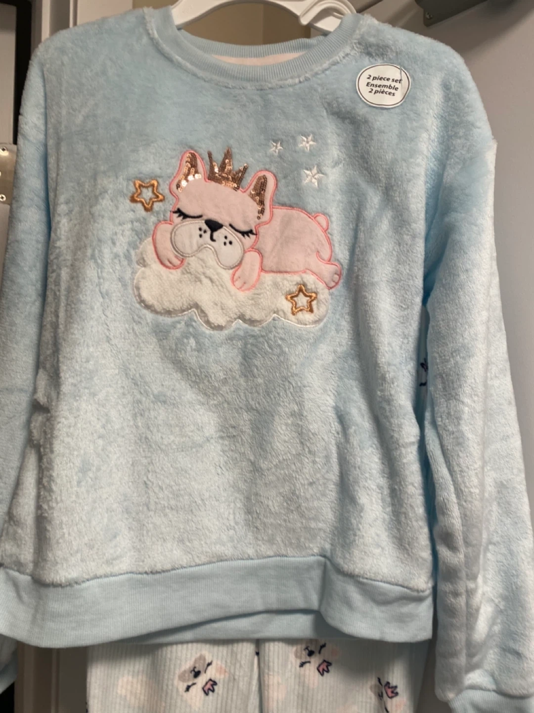 This cozy pajama set features a soft blue fleece pullover top with a cute French bulldog sleeping on a cloud graphic. The matching pants have a playful cloud and Frenchie print. It's a 2-piece set perfect for keeping warm at night!