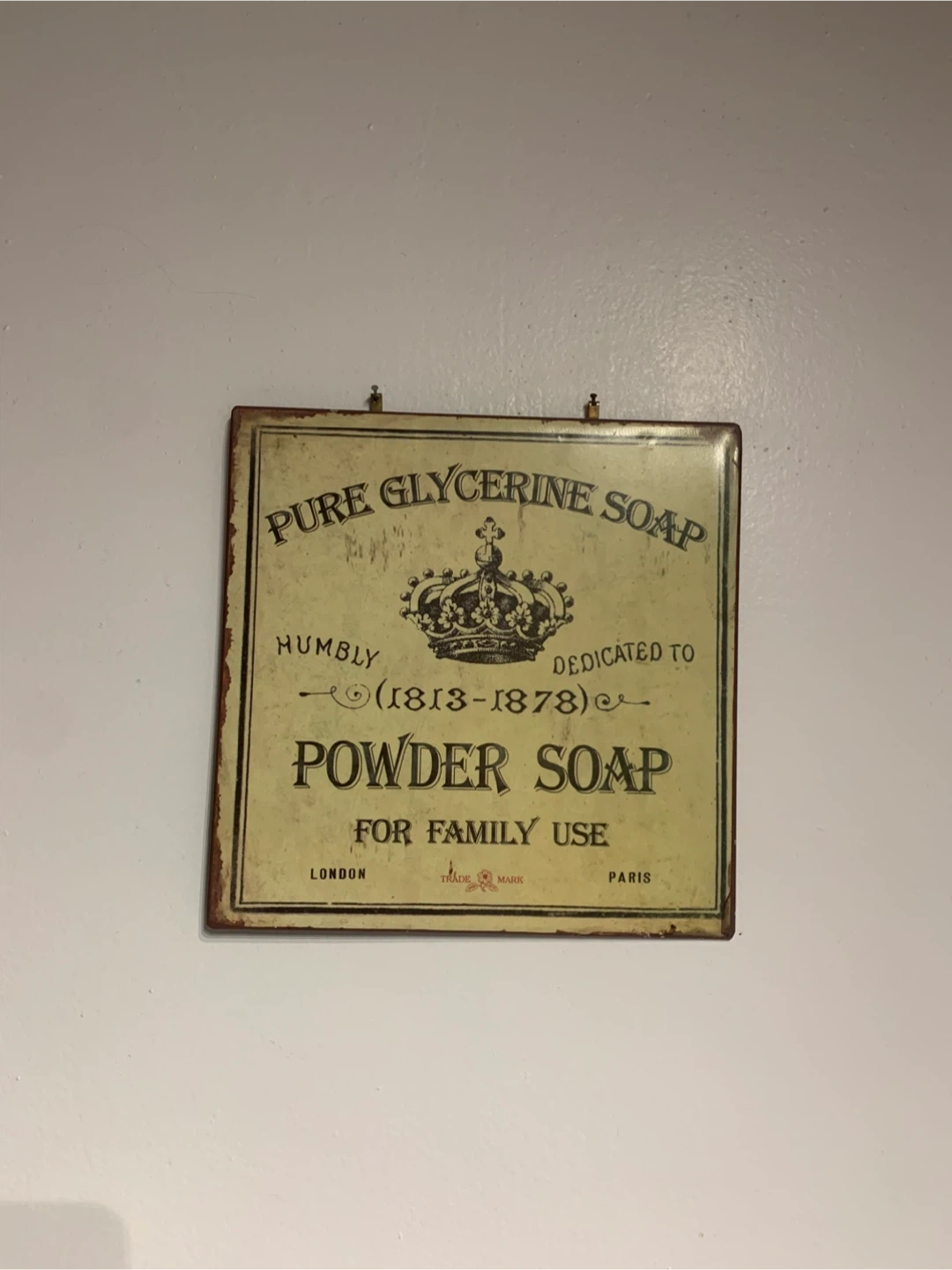 Vintage sign for Pure Glycerine Powder Soap. "Humbly Dedicated to (1813-1878)". For family use. Marked London and Paris.