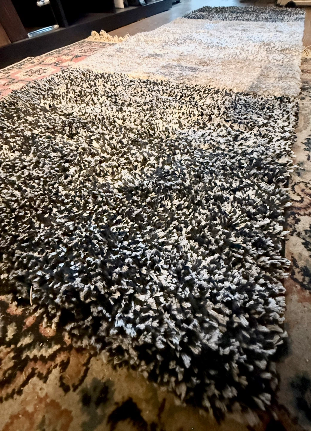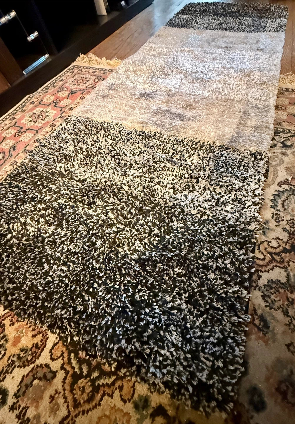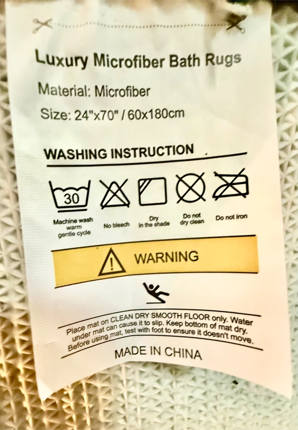 These luxury bath rugs are made of microfiber. They're a generous size at 24 inches by 70 inches. Place on a clean, dry, smooth floor. Keep the bottom of the mat dry.
