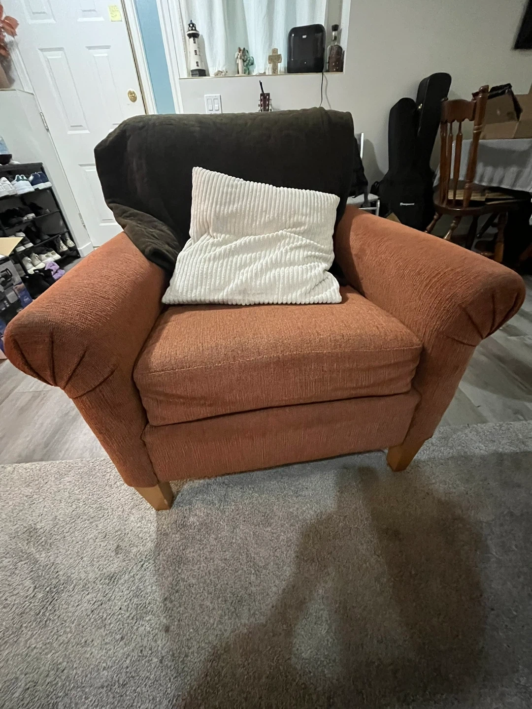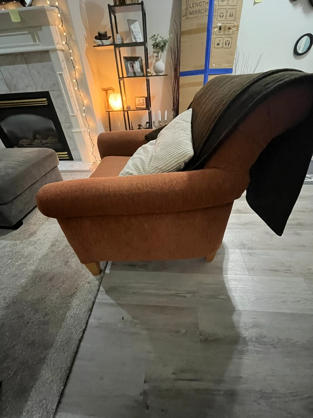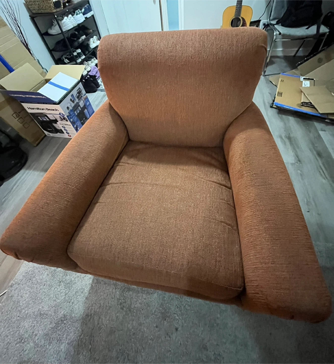 A comfy accent chair with a textured orange fabric upholstery. It's got wide arms and a plush seat cushion, perfect for relaxing. This chair would be great for a living room or den.