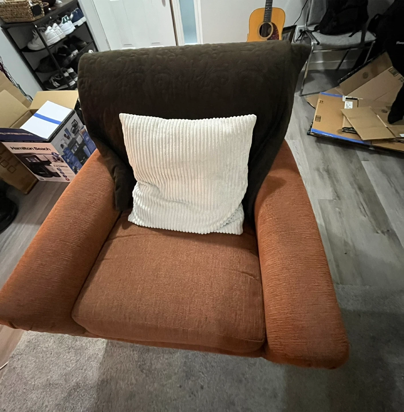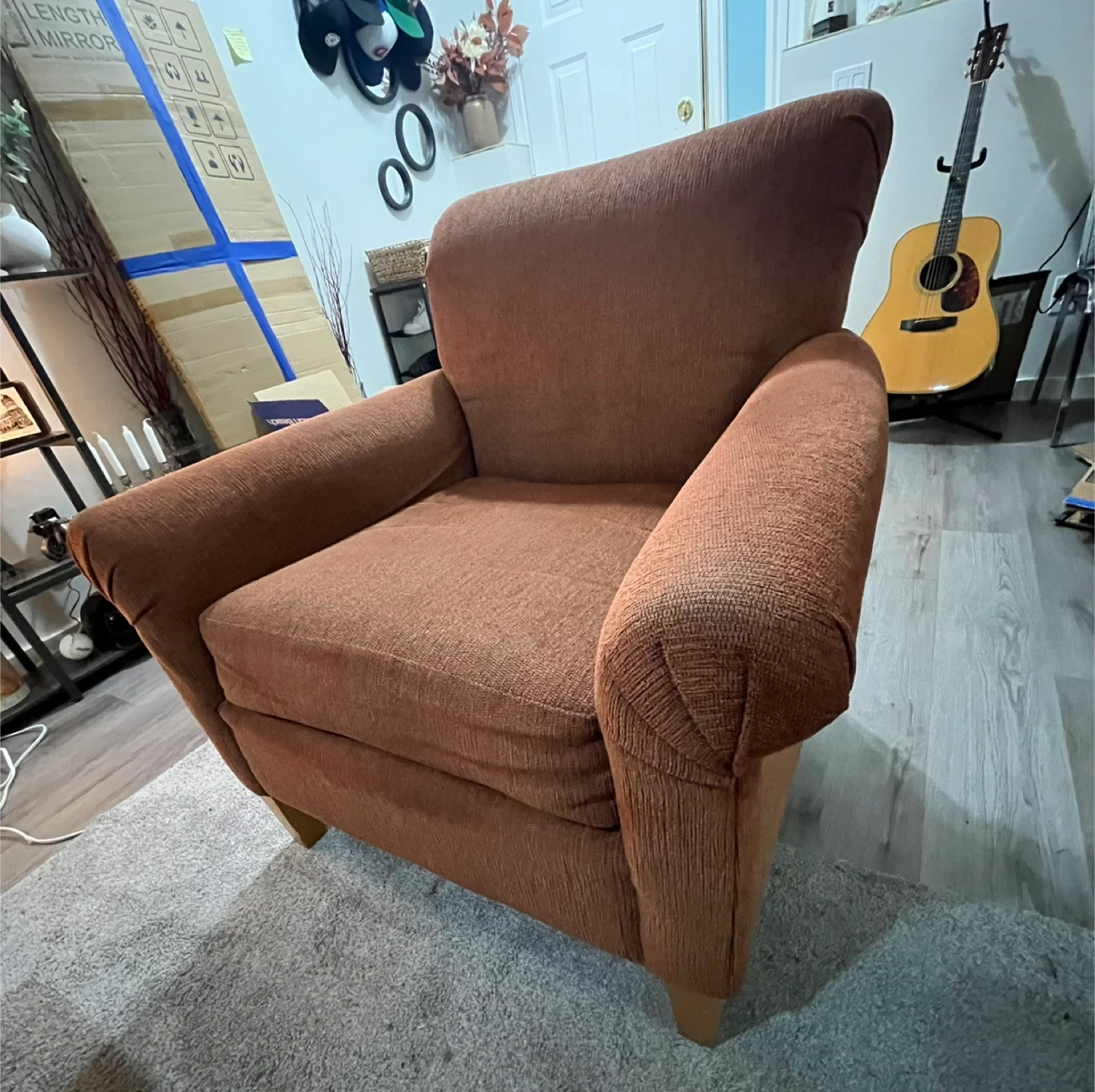 A comfy accent chair with a textured orange fabric upholstery. It's got wide arms and a plush seat cushion, perfect for relaxing. This chair would be great for a living room or den.