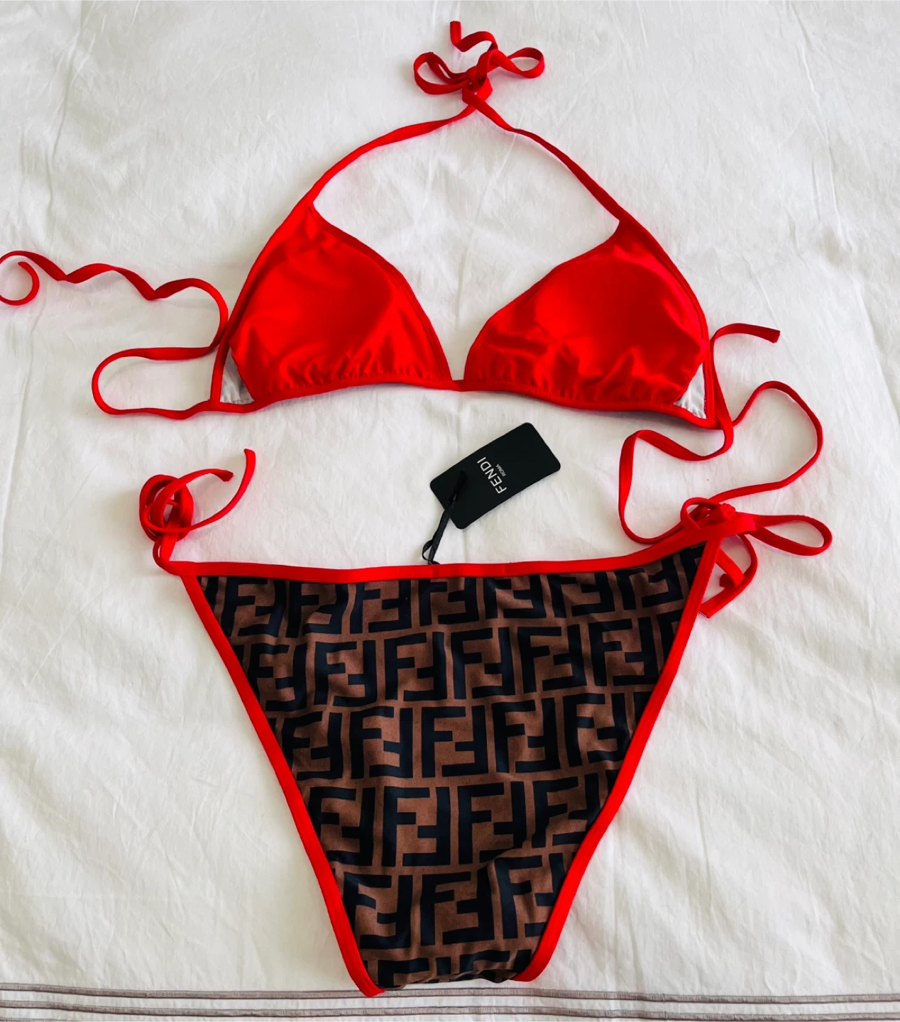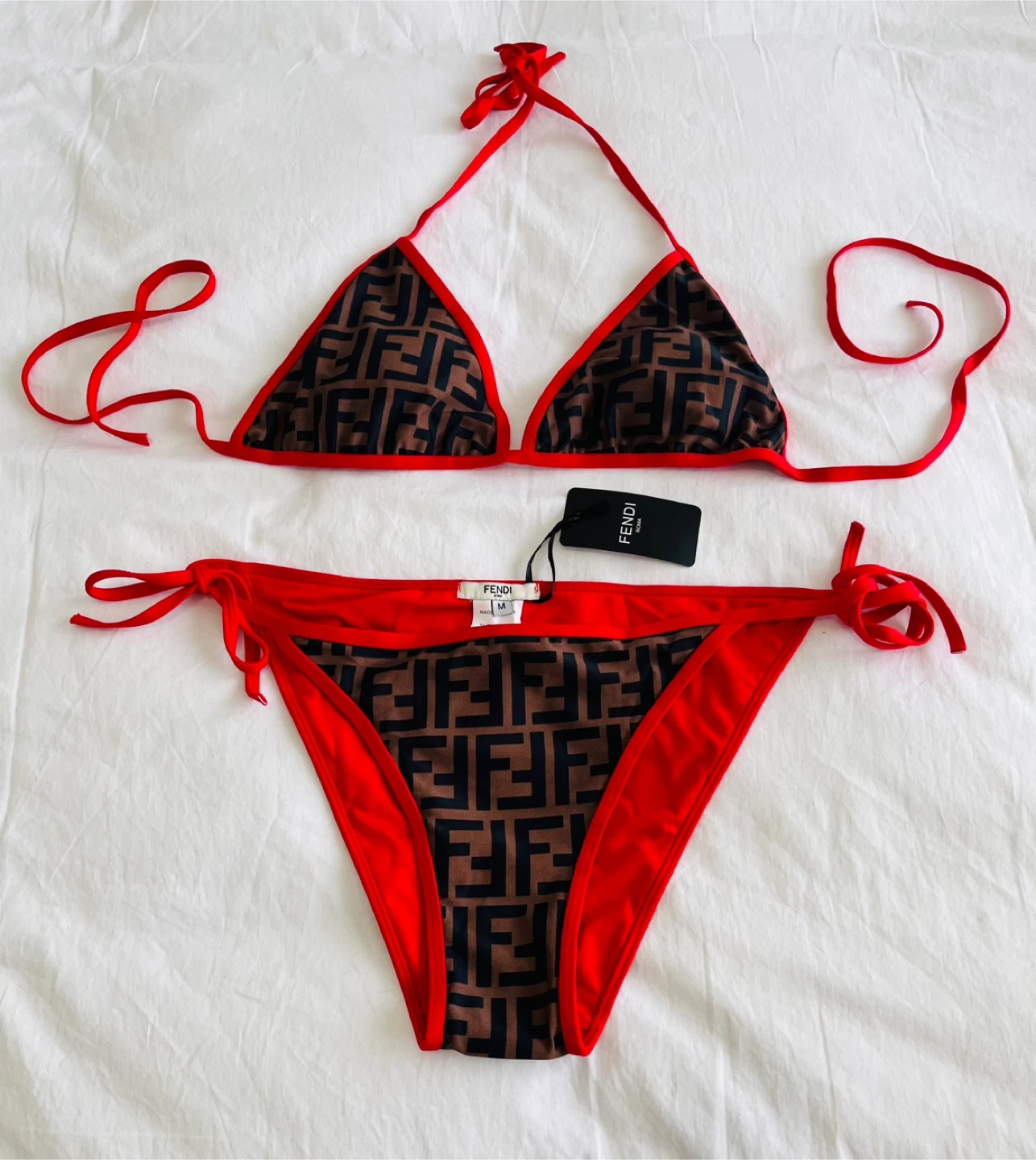 A Fendi bikini featuring the iconic FF logo print on the bottoms and trim. It's a red triangle bikini with adjustable ties. Size is M.
