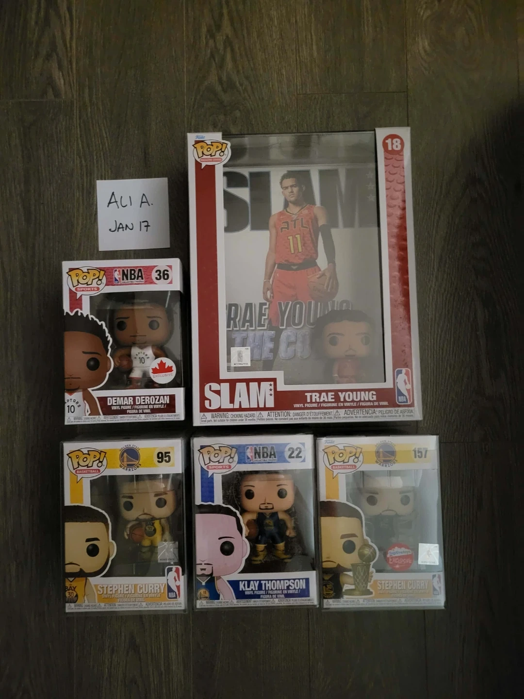 Collection of Funko Pop! NBA vinyl figures featuring various players. Includes Demar DeRozan, Stephen Curry, Klay Thompson, and Trae Young. Some figures come in display boxes. These are great for any basketball fan's collection!