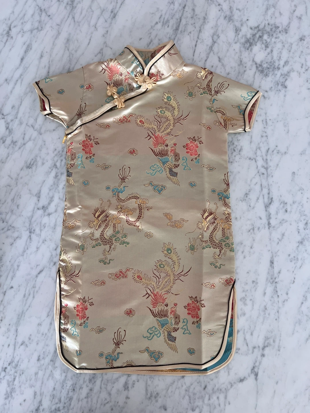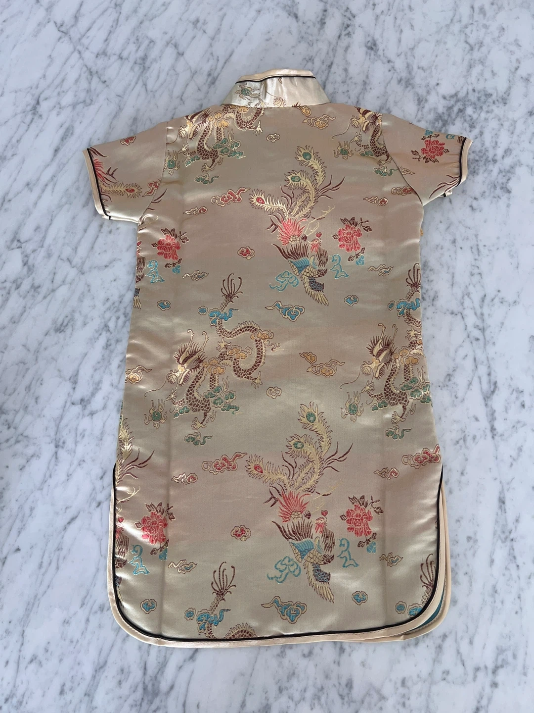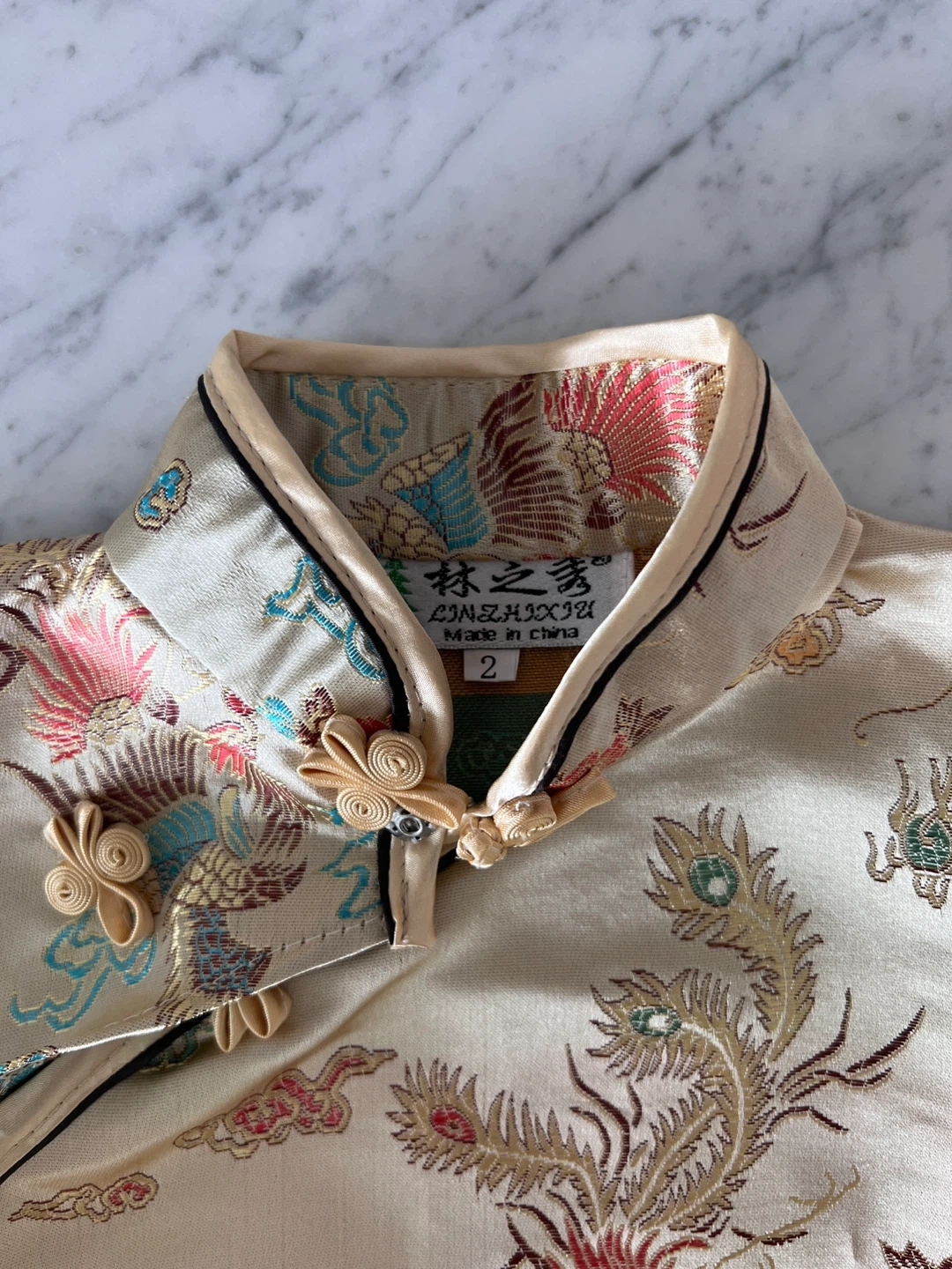Beautiful satin cheongsam dress with a dragon and floral pattern. It features traditional knot buttons and a mandarin collar. Size 2, made in China.