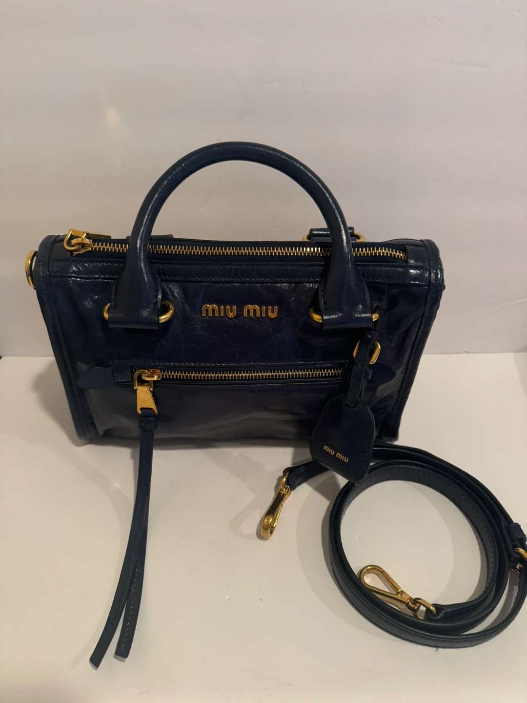 Authentic Miu Miu structured top handle satchel crafted in glossy Vitello Shine leather in a deep navy blue with gold-tone hardware. Features dual rolled top handles, a top zip closure, a front zip pocket, and signature Miu Miu logo at the front. Includes a detachable adjustable shoulder strap for crossbody or shoulder wear.