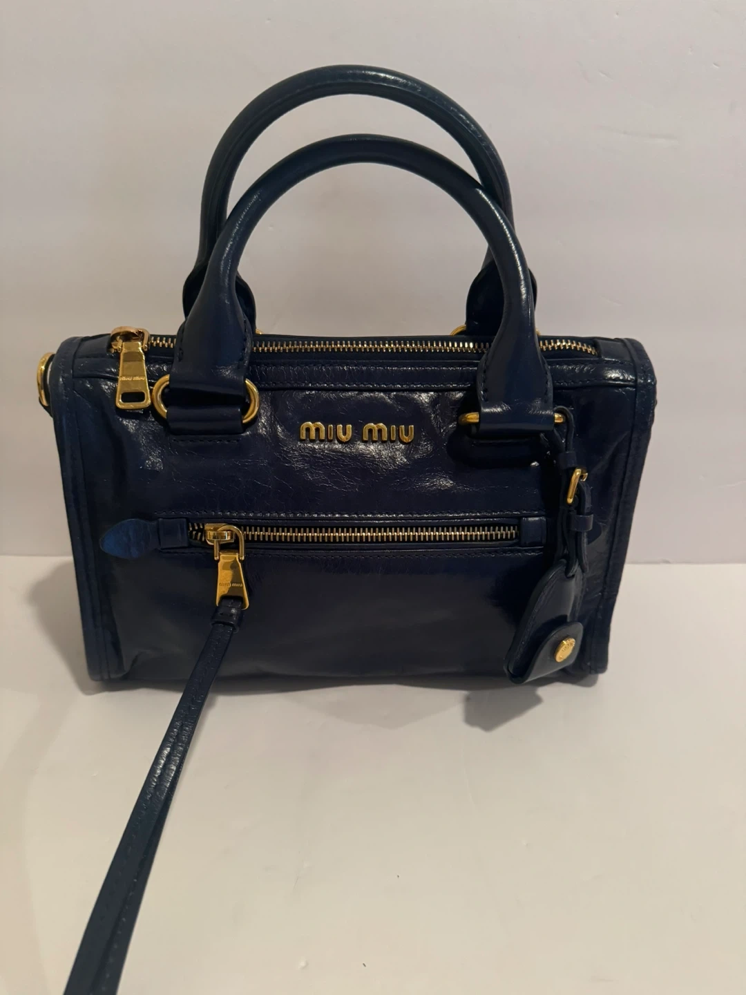 Authentic Miu Miu structured top handle satchel crafted in glossy Vitello Shine leather in a deep navy blue with gold-tone hardware. Features dual rolled top handles, a top zip closure, a front zip pocket, and signature Miu Miu logo at the front. Includes a detachable adjustable shoulder strap for crossbody or shoulder wear.