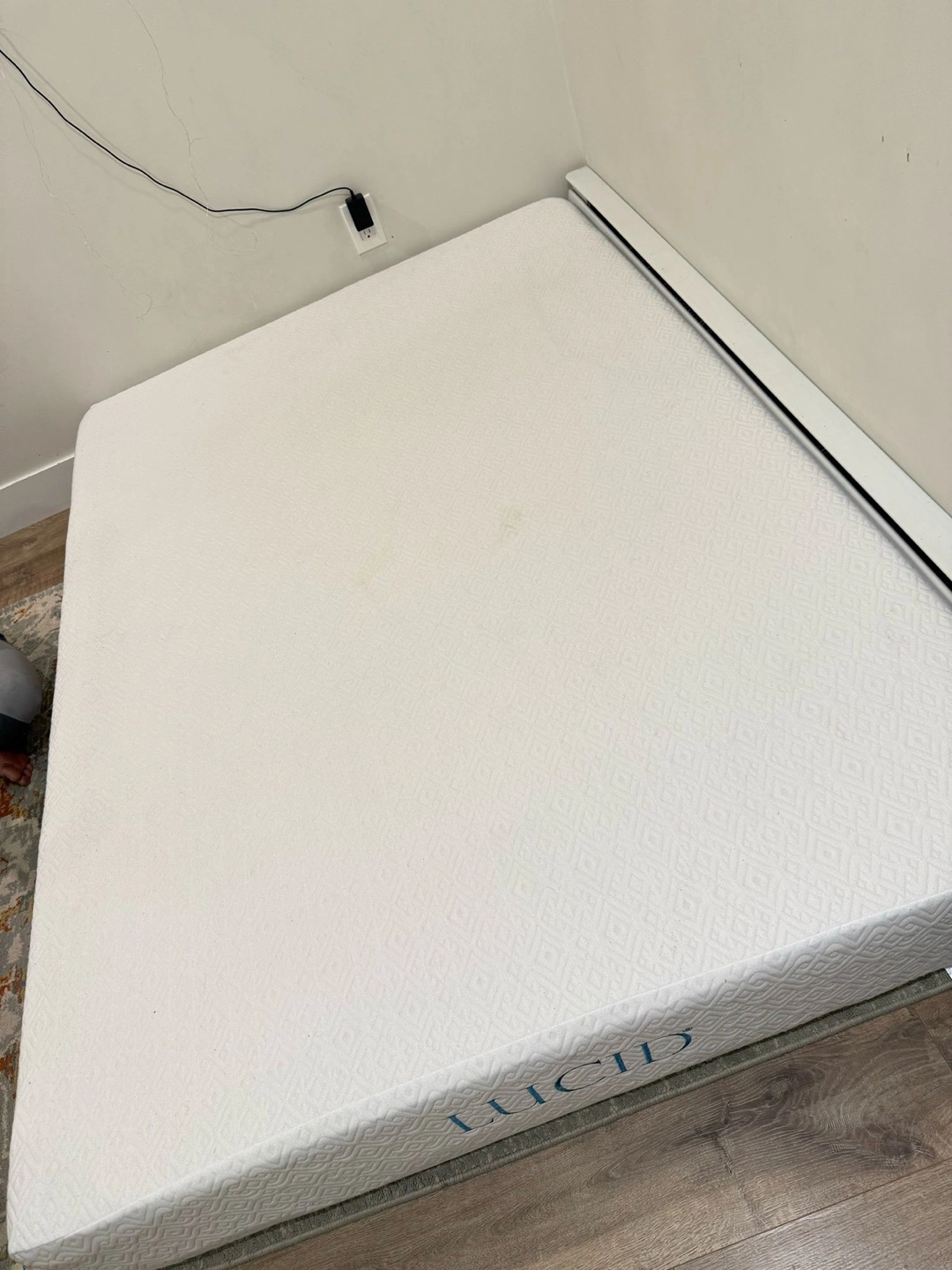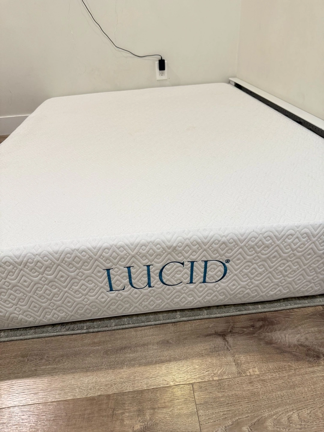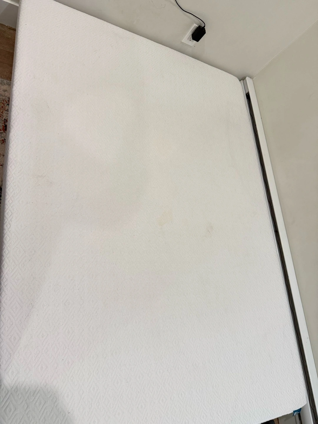 A white queen size mattress. Features the brand name in blue. It is very very comfortable and in good condition. We have had it for 5 years.