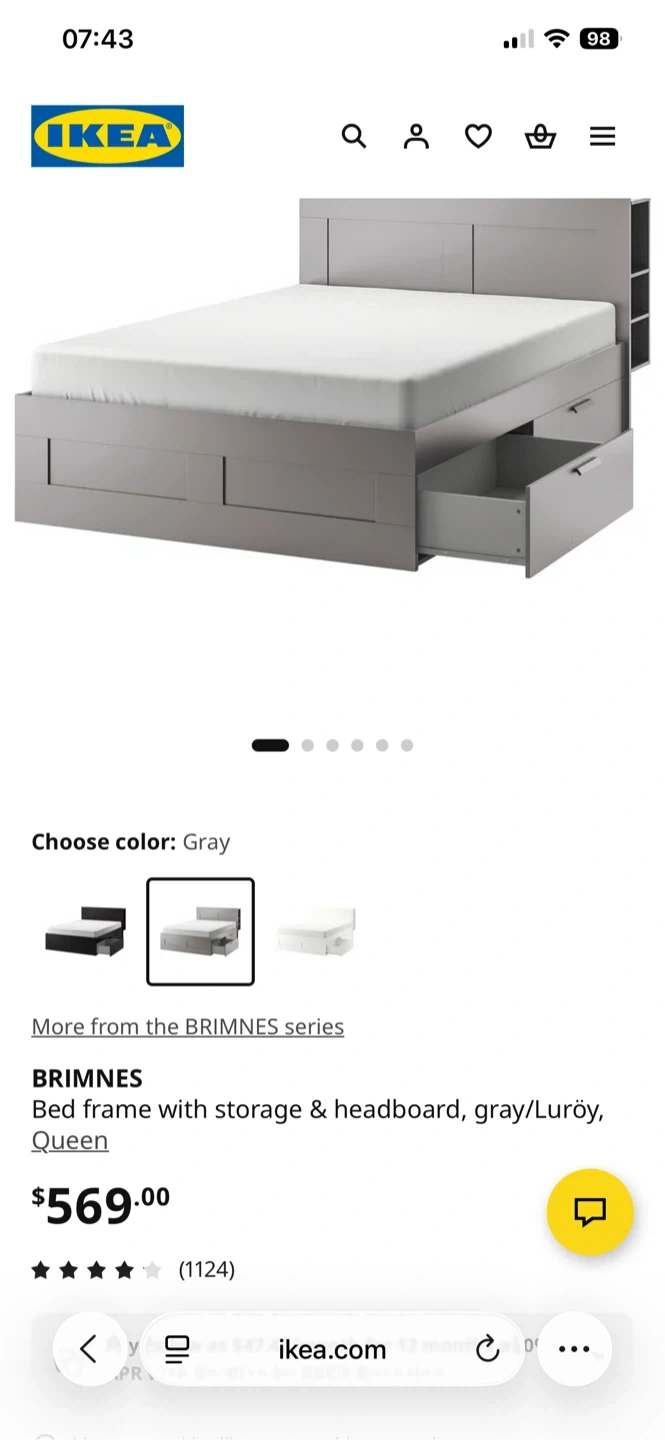 IKEA BRIMNES twin bed frame in gray, featuring built-in storage drawers ($369+tax). Headboard is from Stuctube (Nino modern suspended headboard $129+tax). This bed frame is great for maximizing bedroom space.