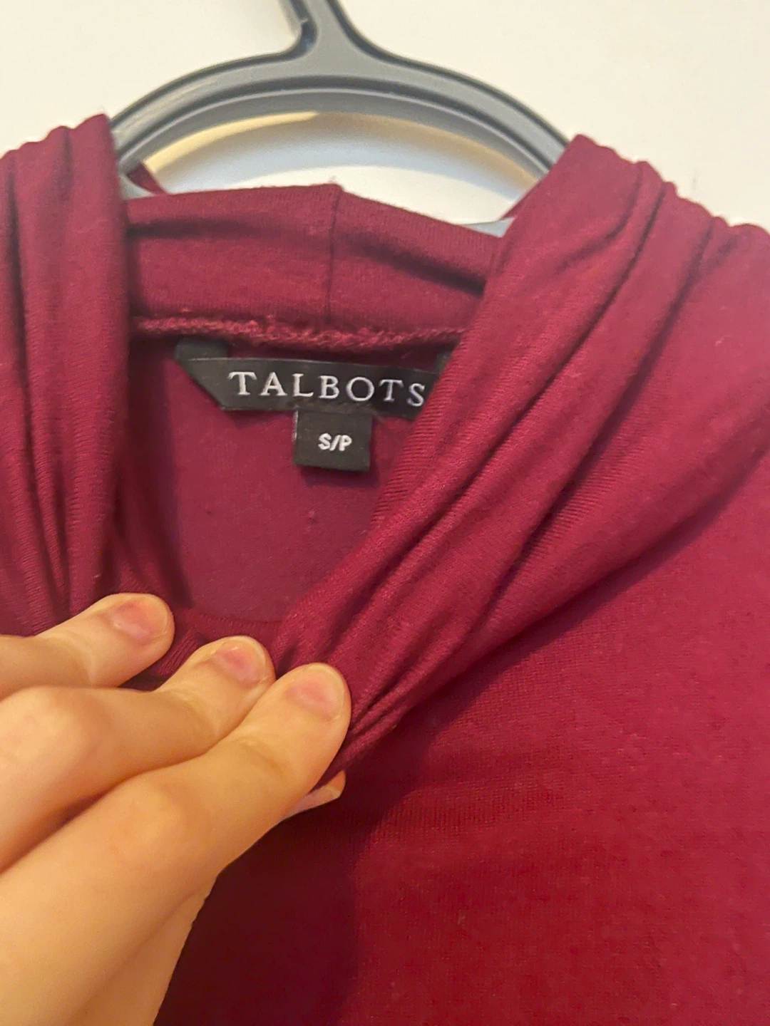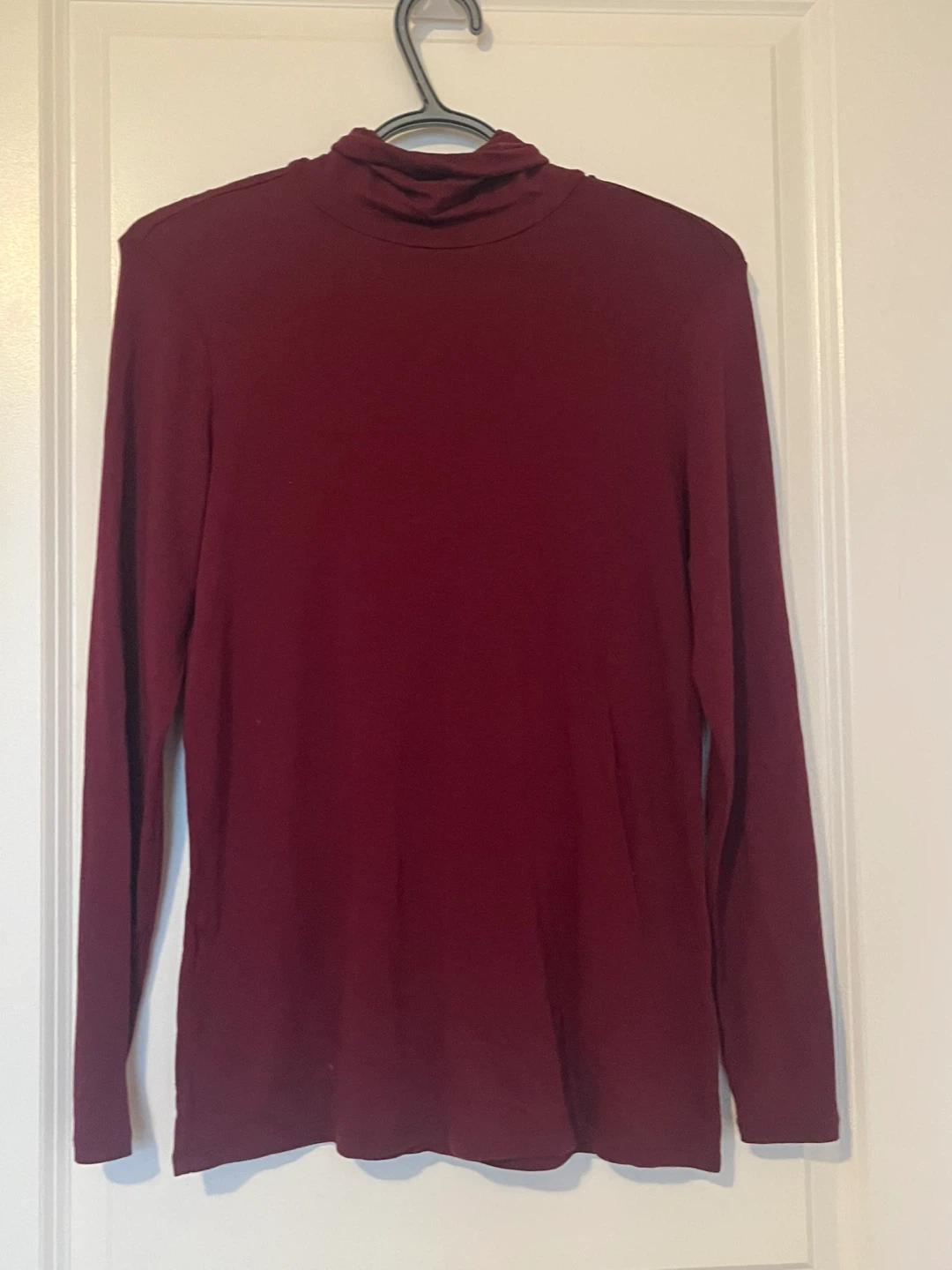 A Talbots burgundy turtleneck in size S/P. It's in great condition and perfect for layering or wearing on its own. The material is soft and comfortable, making it a cozy addition to your wardrobe!