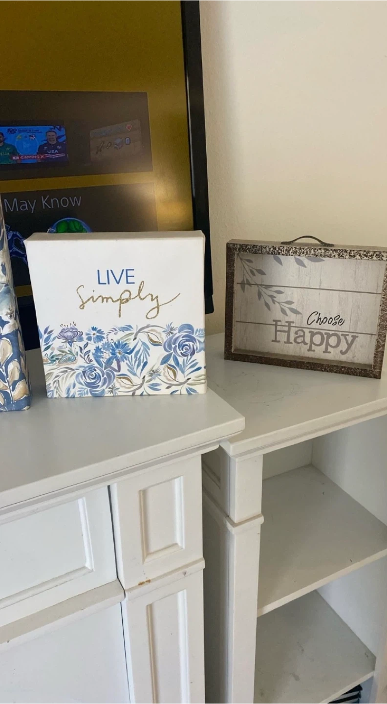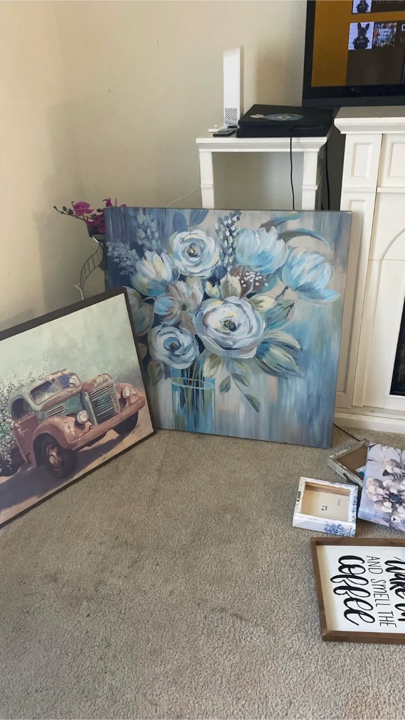 Set of decorative wall art pieces. Includes floral prints, a vintage truck scene, and inspirational quote signs. Great for adding a touch of personality to any room!