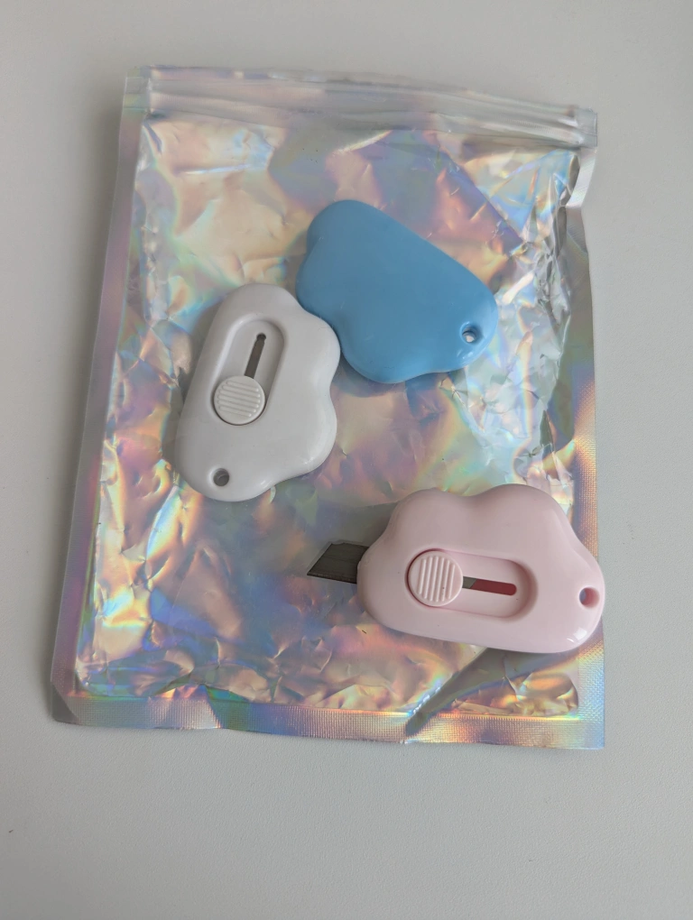 Three pastel-coloured cloud-shaped utility cutters. Perfect for craft projects, scrapbooking or stationery supplies. I use them throughout the house for opening packages.
