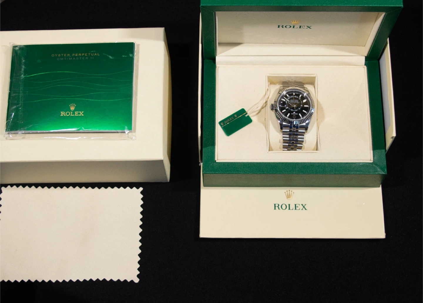 This is a Rolex Oyster Perpetual GMT-Master II watch. It includes the original box, manual, and polishing cloth. Its stainless steel construction ensures durability and a timeless look.