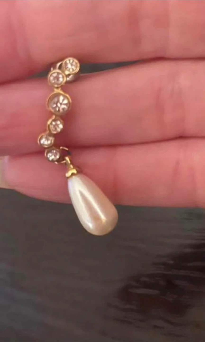 These are a pair of elegant pearl drop earrings. They feature a gold-tone setting with sparkling stones leading to the pearl drops. Perfect for adding a touch of sophistication to any outfit! 80’s/90’s