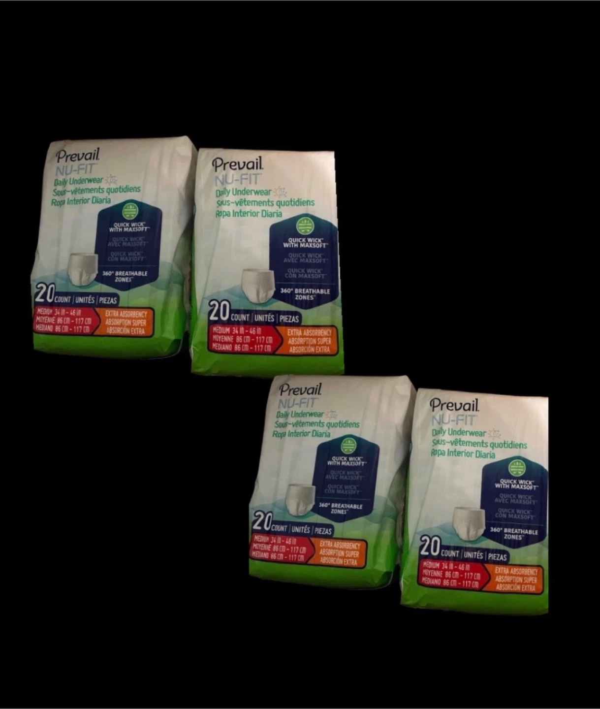4 packs of Prevail NU-FIT Daily Underwear in size Medium. Each pack contains 20 individually wrapped units.