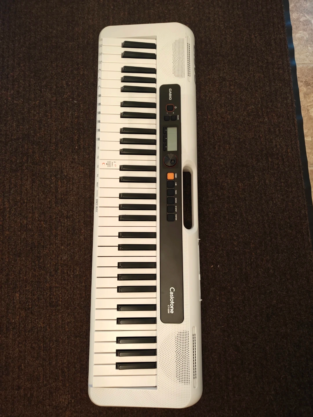This is a white Casio Casiotone CT-S200 keyboard. It has 61 keys and a compact design. The keyboard includes a variety of tones and rhythms for learning and playing music.
