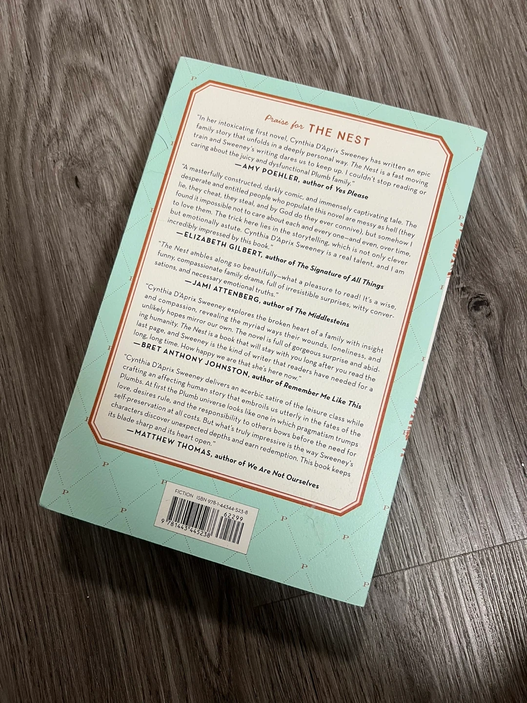 This is a novel titled The Nest by Cynthia D'Aprix Sweeney. It's a story about a dysfunctional family and their inheritance. A great read for anyone who enjoys contemporary fiction!