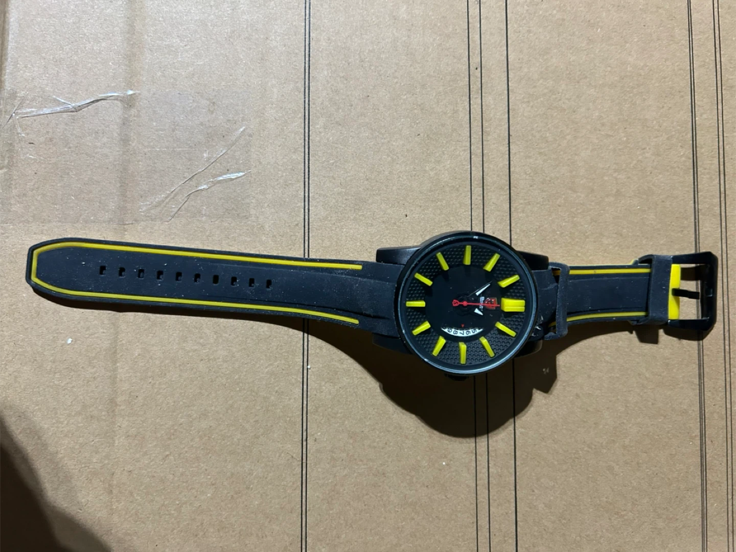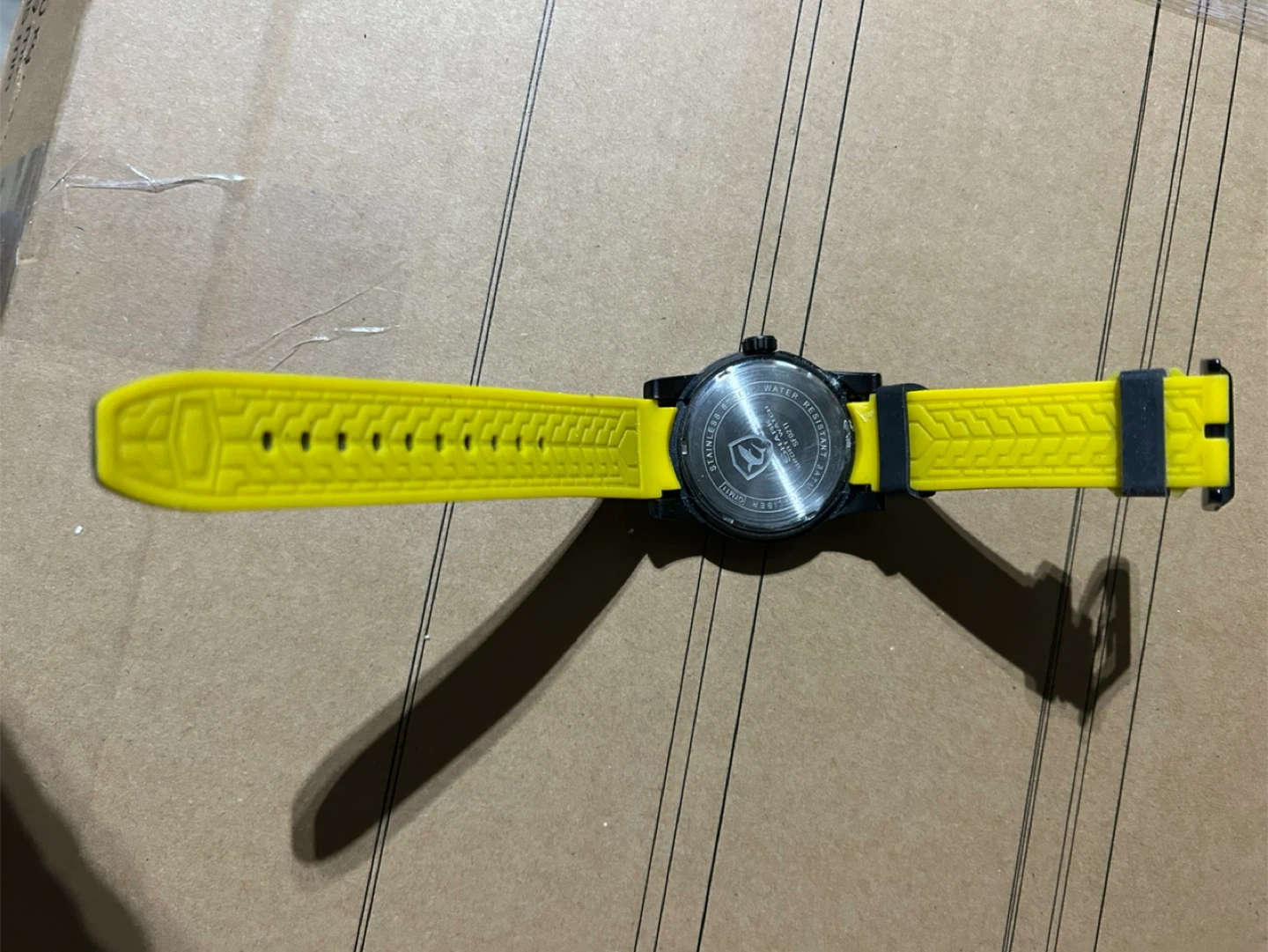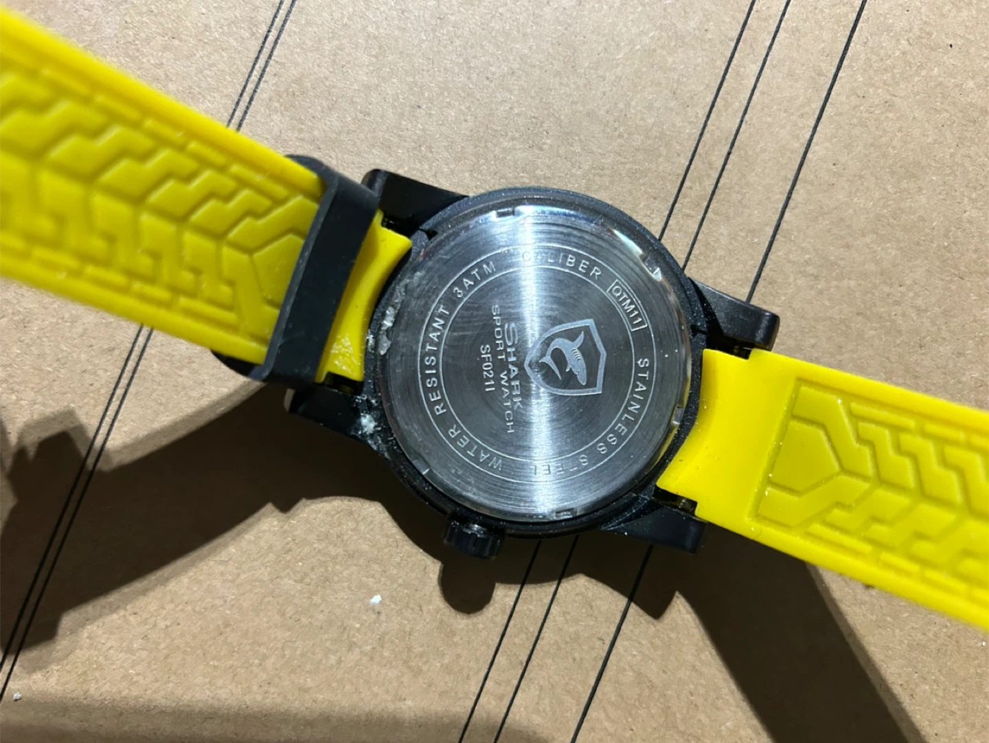 Selling a Shark Sport watch in black with yellow accents. It's water-resistant to 3ATM and has a stainless steel back. The watch has a sporty look and is in good condition!