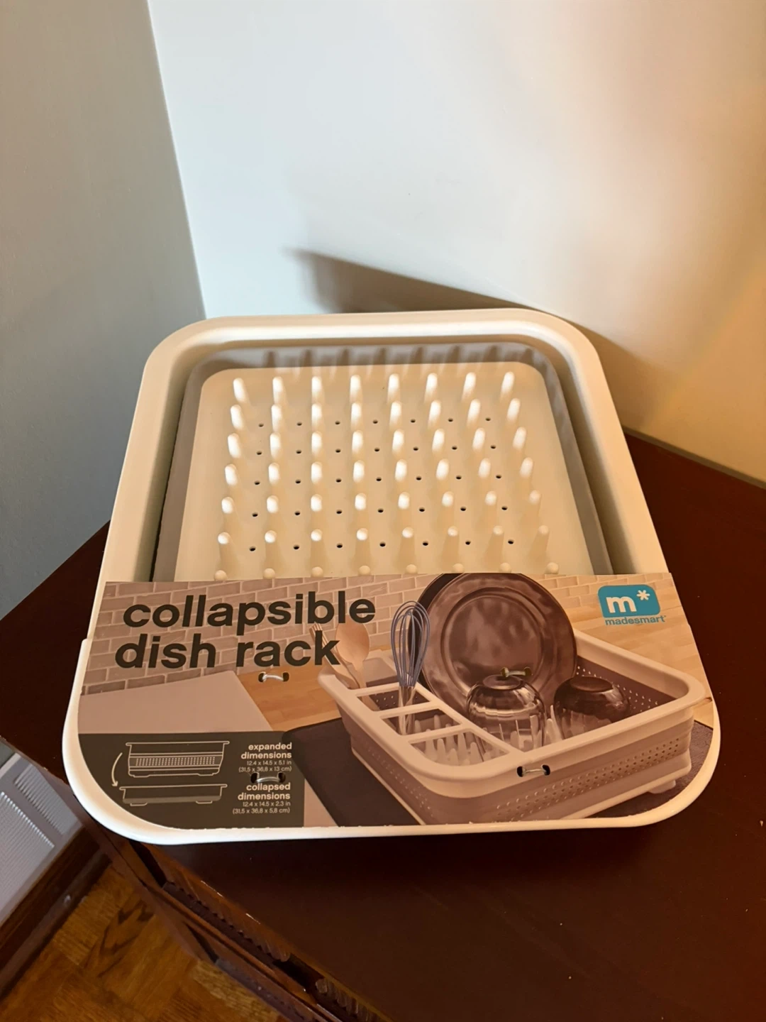 This is a white and grey Madesmart collapsible dish rack. It has expanded dimensions of 12.4 x 14.5 x 5.1 inches and collapsed dimensions of 12.4 x 14.5 x 2.3 inches. It's great for small kitchens or for extra drying space when needed!
