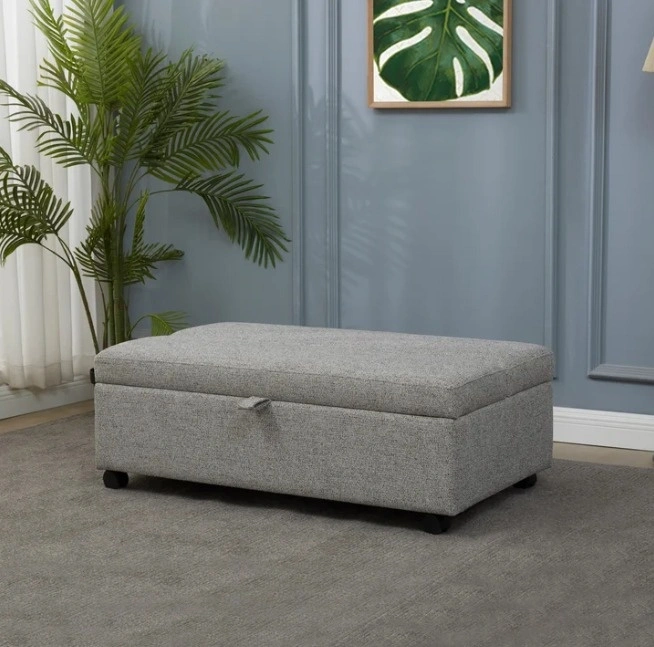Emorie sleeper ottoman that turns into a bed. This is a great alternative to a sofa bed, perfect for guests. It's made with polyester fabric upholstery, high-density foam, and a premium sleeper frame that eliminates the uncomfortable bar you might feel in other models. The mattress is 5.1 cm (2 in.) foam with a 2.5 cm (1 in.) gel topper. It has a solid hardwood frame and locking casters for easy moving. Assembly is required.