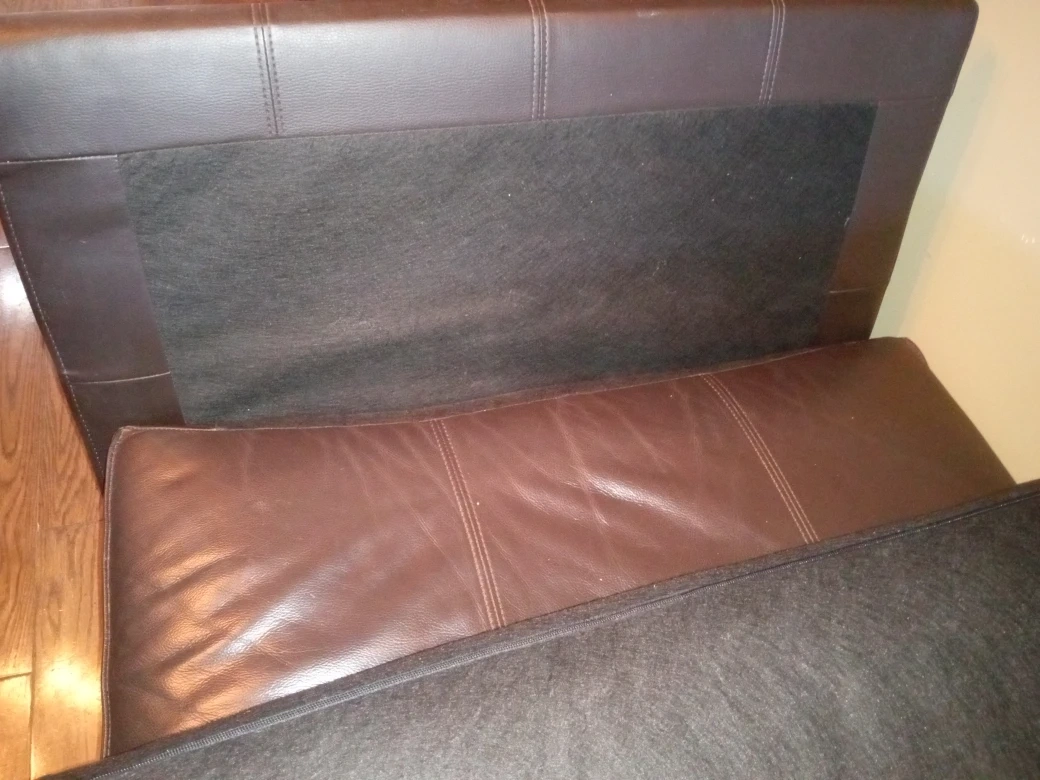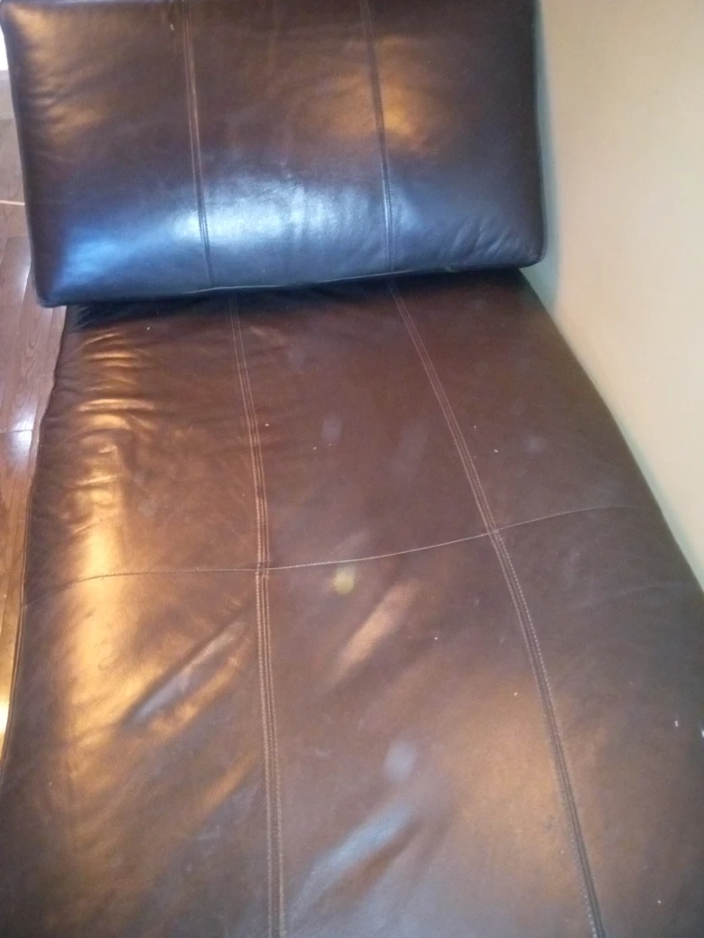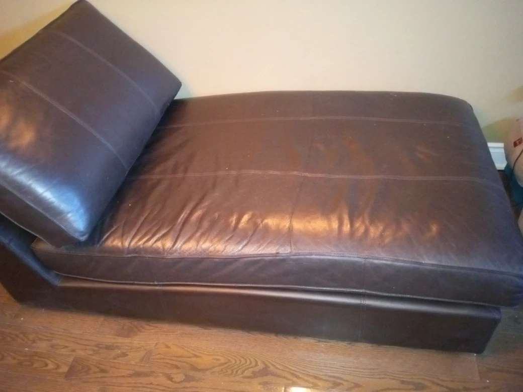 This chaise lounge is upholstered in a dark brown faux leather. It features a plush attached cushion and segmented stitching detail. It's a comfy spot for relaxing.
