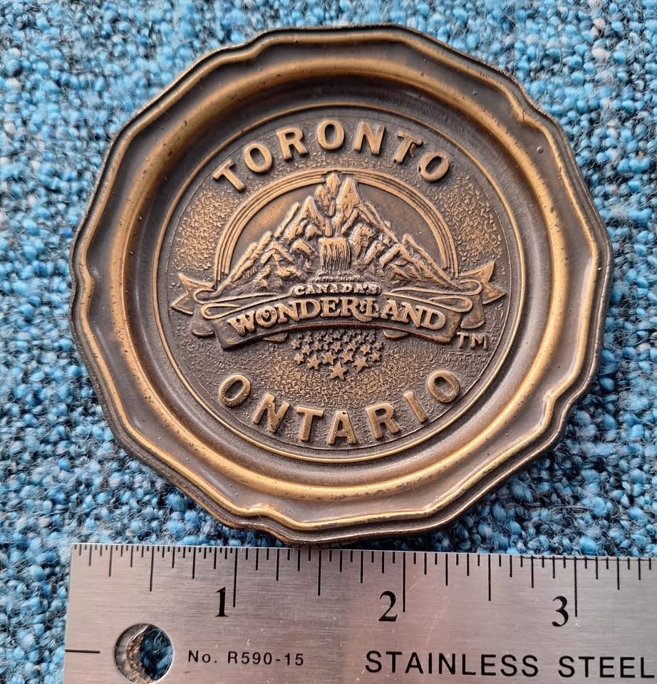 This bronze-tone metal medallion is an authentic souvenir from Canada's Wonderland's 1981 inaugural year. It bears the inscription 'Toronto, Ontario' and was manufactured in Canada by Century. Measures approximately 3 inches in diameter, making it a nice display piece.
