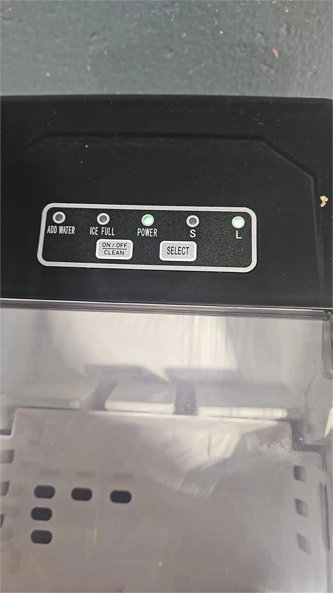 Compact ice maker. Makes 9 cubes in 6 minutes. Produces 26 lbs of ice daily. 1.2L water tank. Includes ice scoop and basket. Self-cleaning function.
