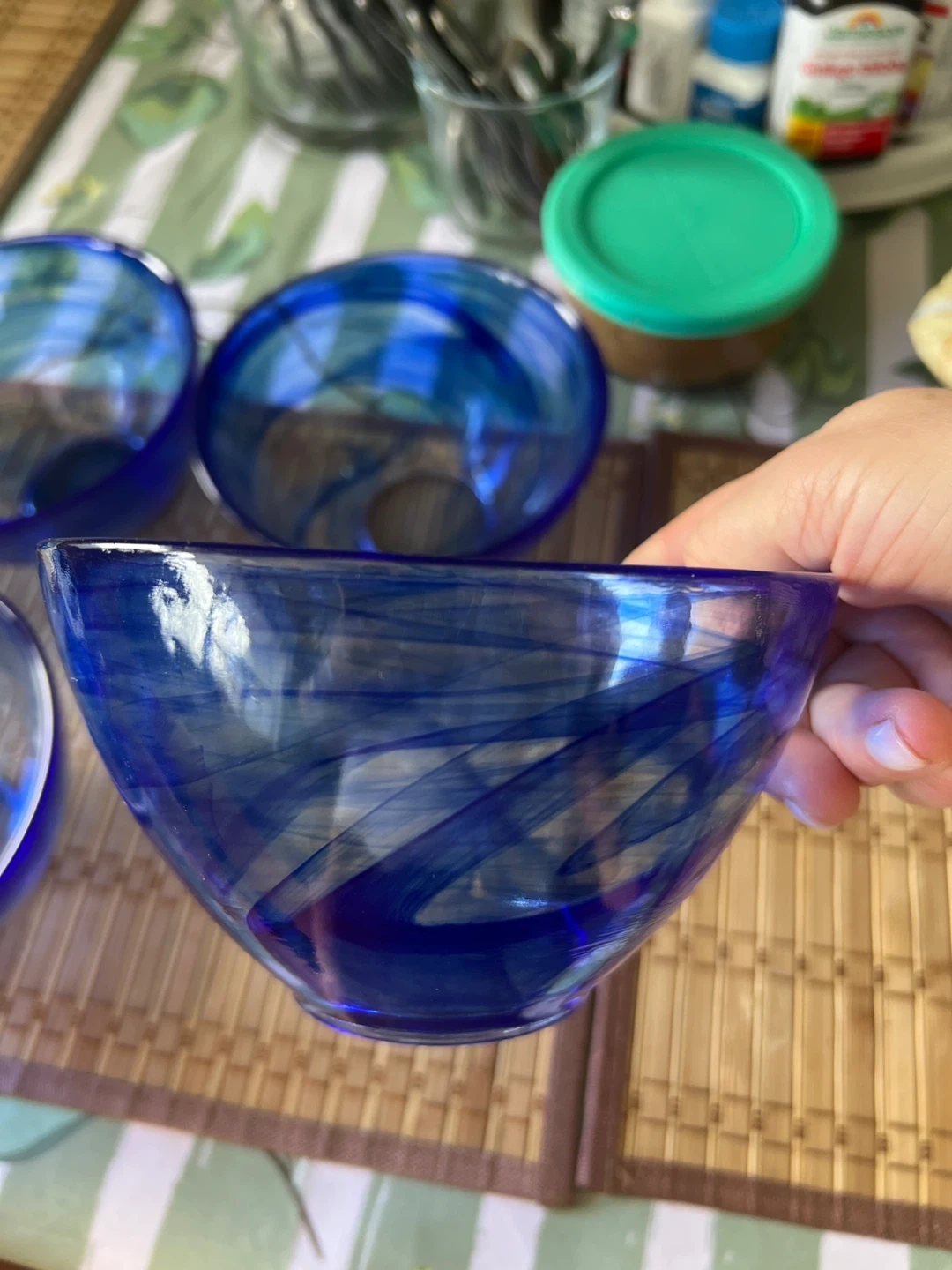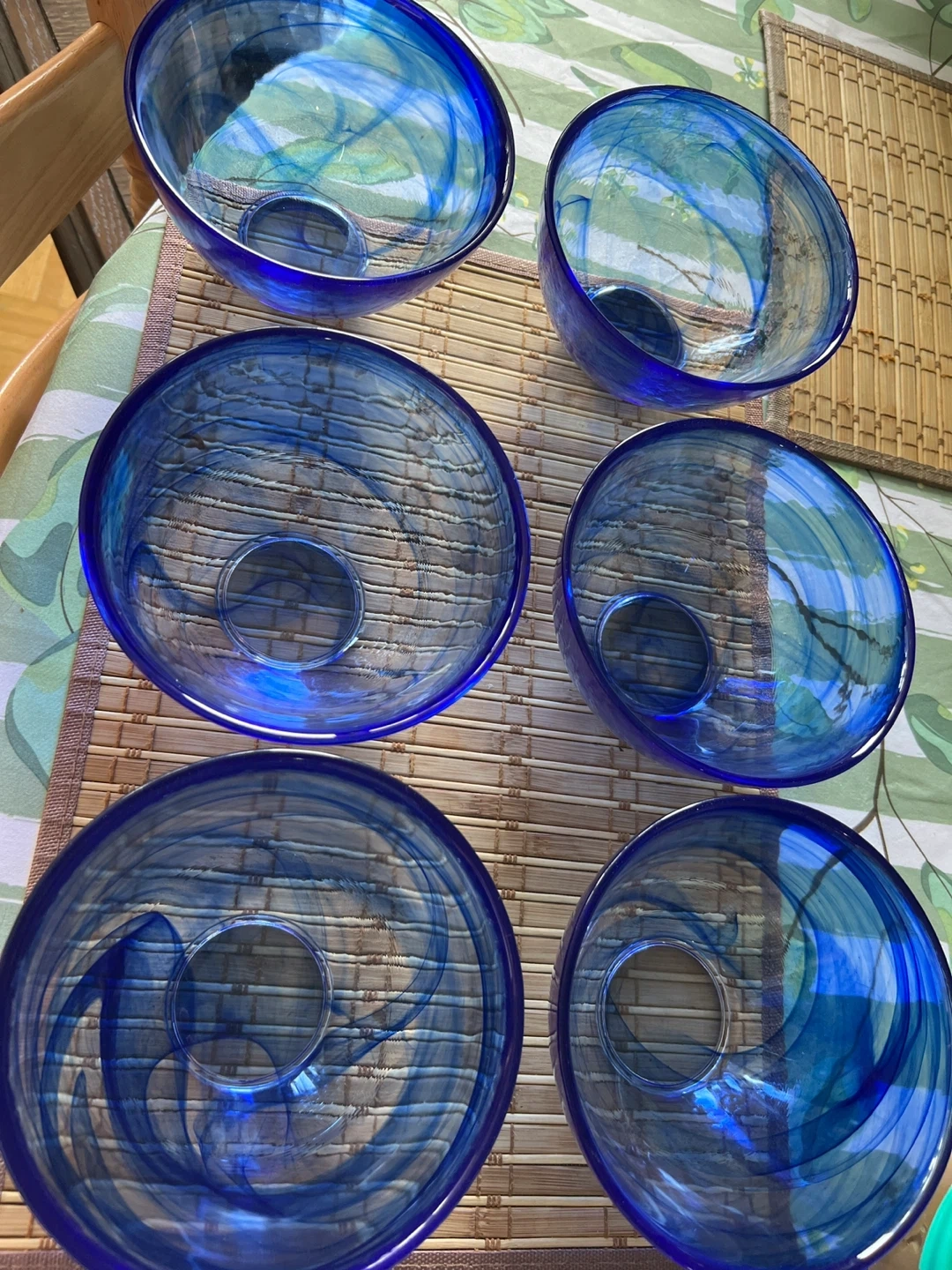 A set of six glass bowls featuring a beautiful blue swirl design. These bowls are perfect for serving snacks, dips, or desserts. They're made of durable glass and add a pop of colour to any table setting.