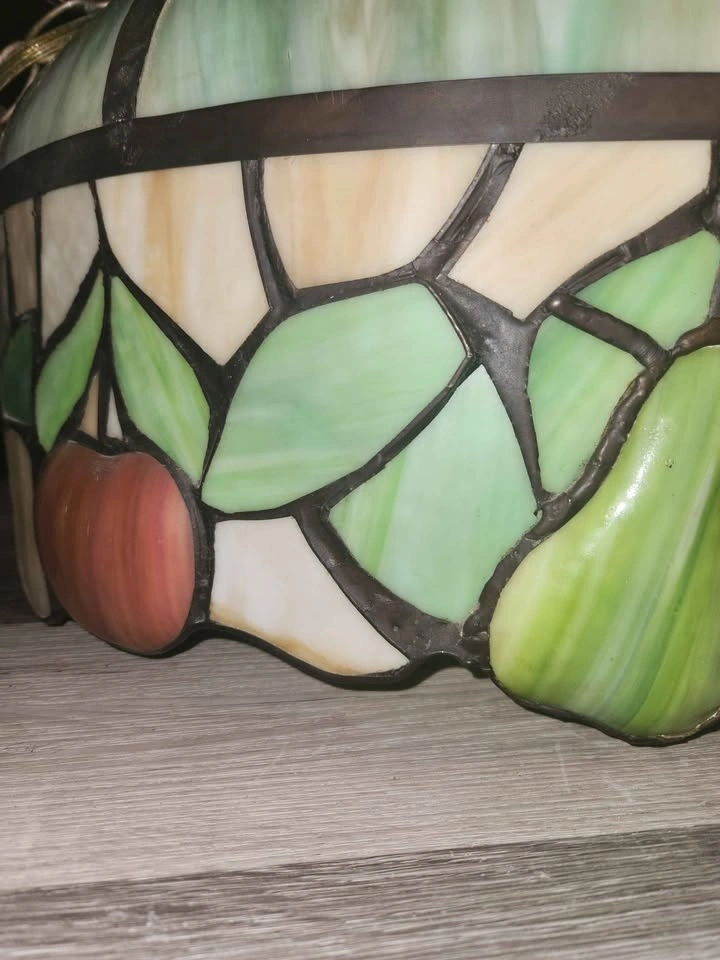 What sets these apart from modern reproductions is the incredible 3D molded fruit border. The apples, pears, and grapes are physically rounded and protrude from the shade, creating a beautiful sculptural effect and deep light refraction when lit.