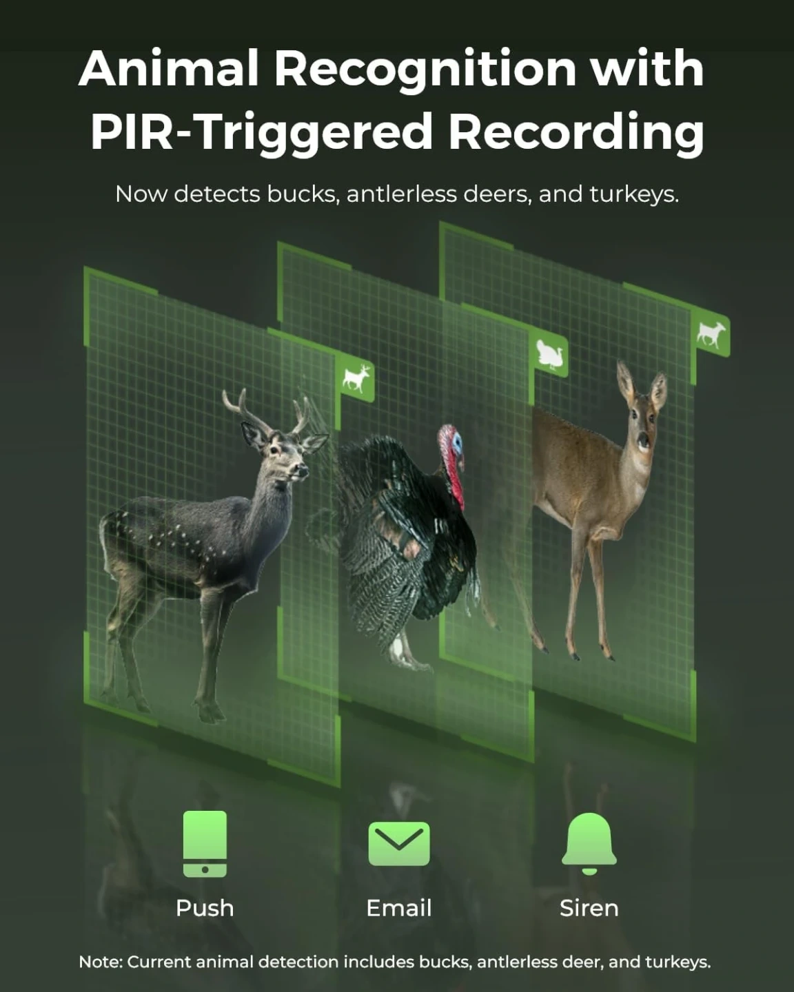 SMART DETECTION & LIVE VIEW: Smartly distinguish person/vehicle movements from other objects, minimizing false alarms. With upgraded animal detection, it now includes bucks, antlerless deer, and turkeys. When motion is detected, the camera captures snapshots and sends push/email/siren alerts. Easily view the captured moments on the Reolink app with no monthly fee.