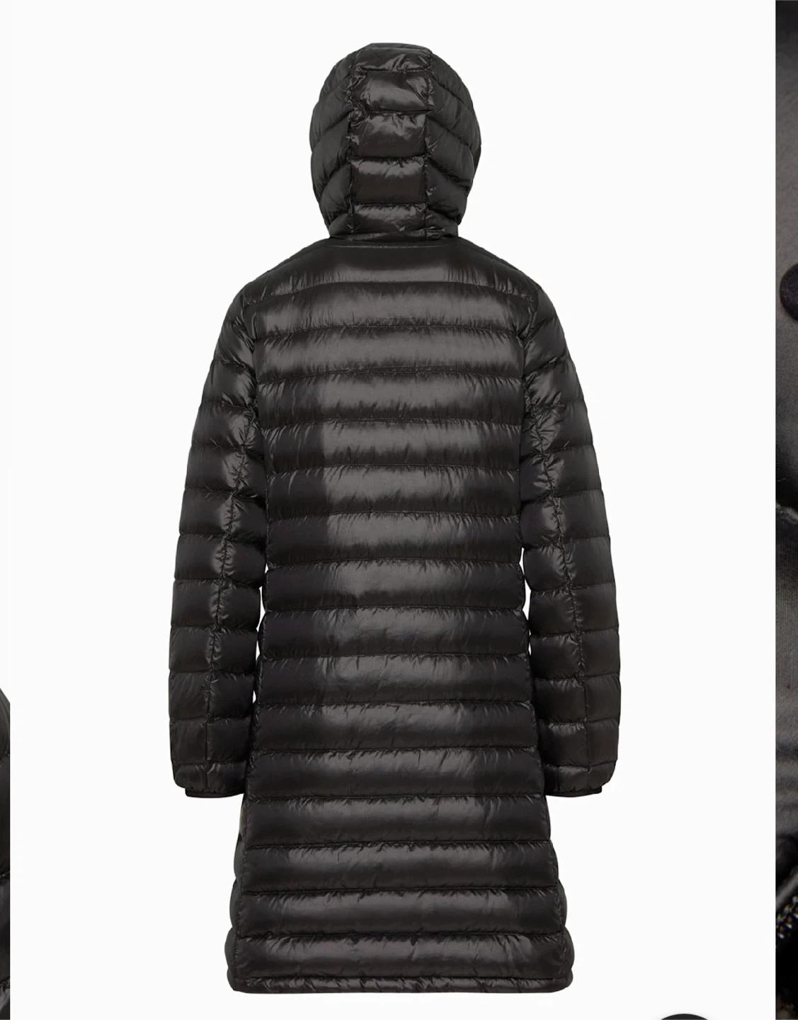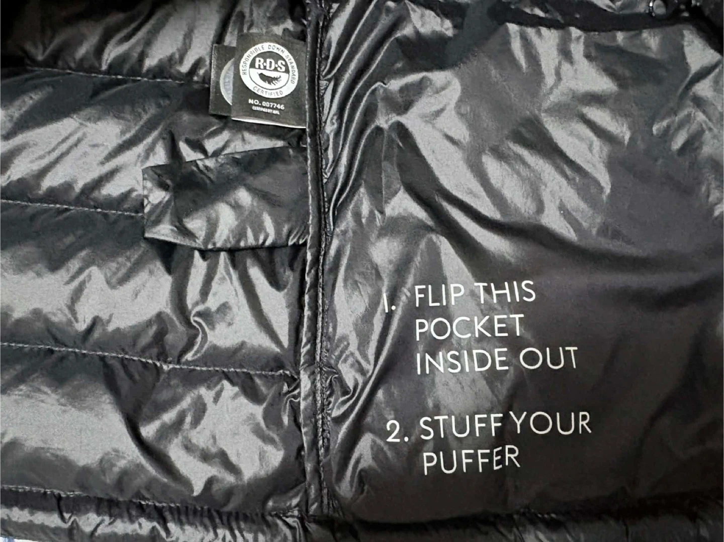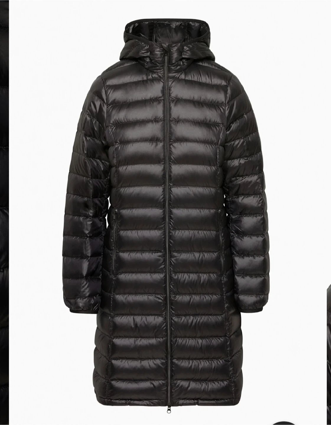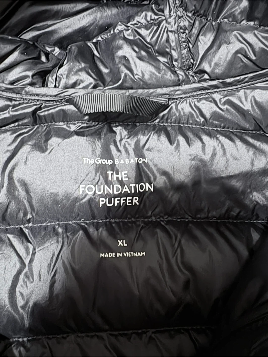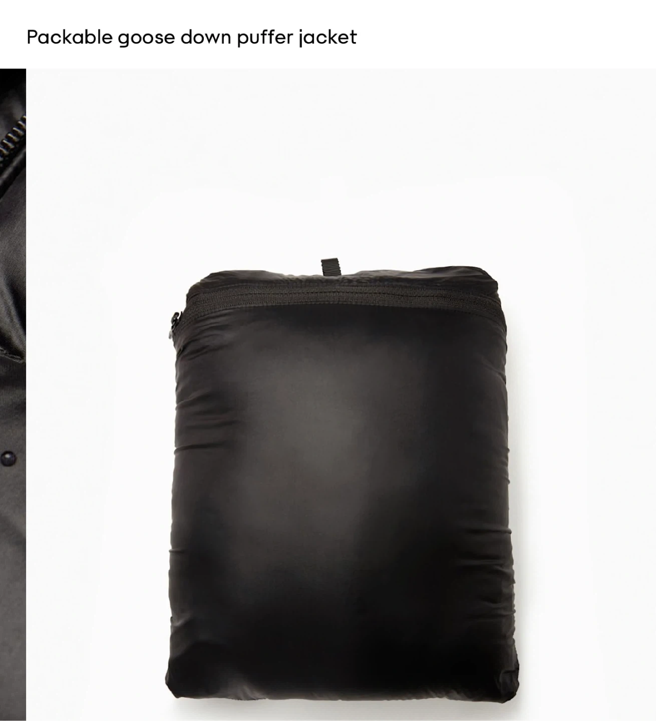 Black goose down puffer jacket with a hood. It's packable and lightweight. Includes a stuff sack for storage. This jacket is great for cold weather layering. The foundation puffer