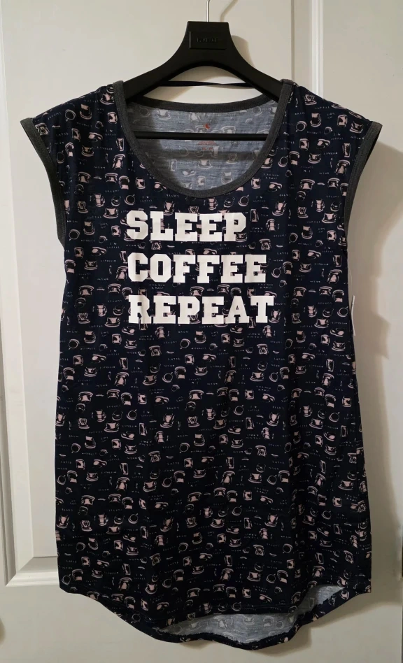 Cute and comfy nightgown with a fun coffee-themed print! It features the words "Sleep Coffee Repeat" and is a size XS. Perfect for a cozy night's sleep or lounging around the house
