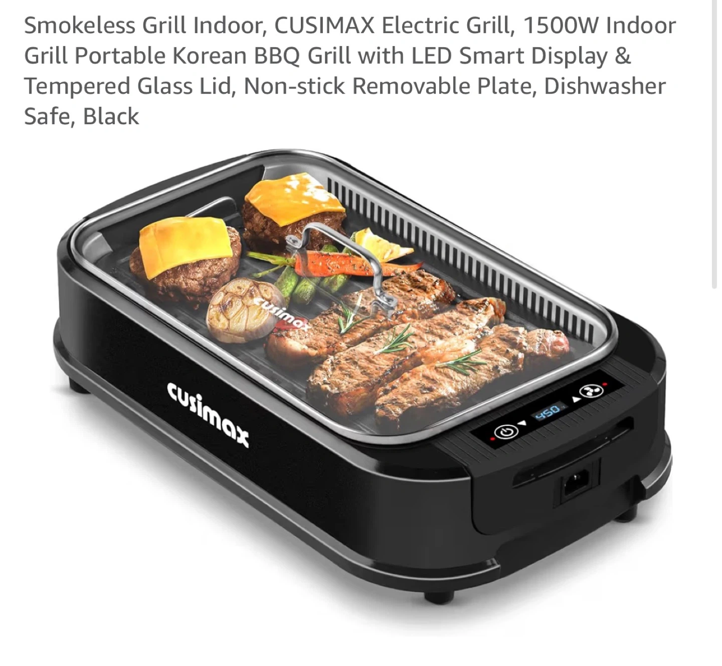 This CUSIMAX electric grill features a 1500W motor and a non-stick removable plate. It has a tempered glass lid and a dishwasher-safe design. The LED smart display offers easy temperature control.