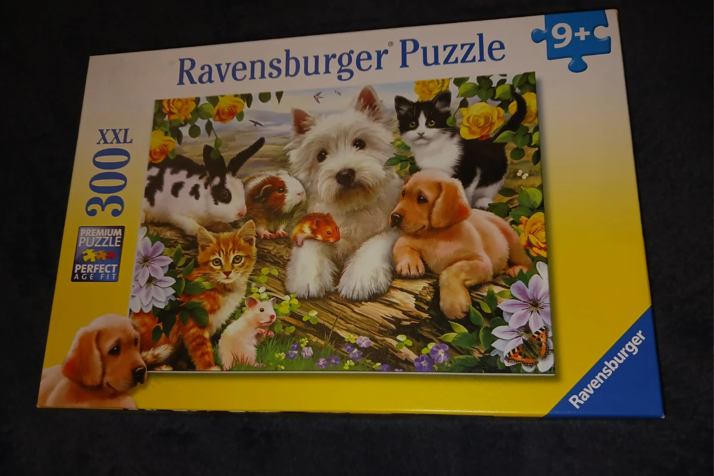 This Ravensburger puzzle features 300 pieces and an XXL size. It showcases a charming scene with various cute animals, including dogs, cats, a hamster, a guinea pig, and a rabbit. The pieces are made with Ravensburger's premium quality for a perfect fit.